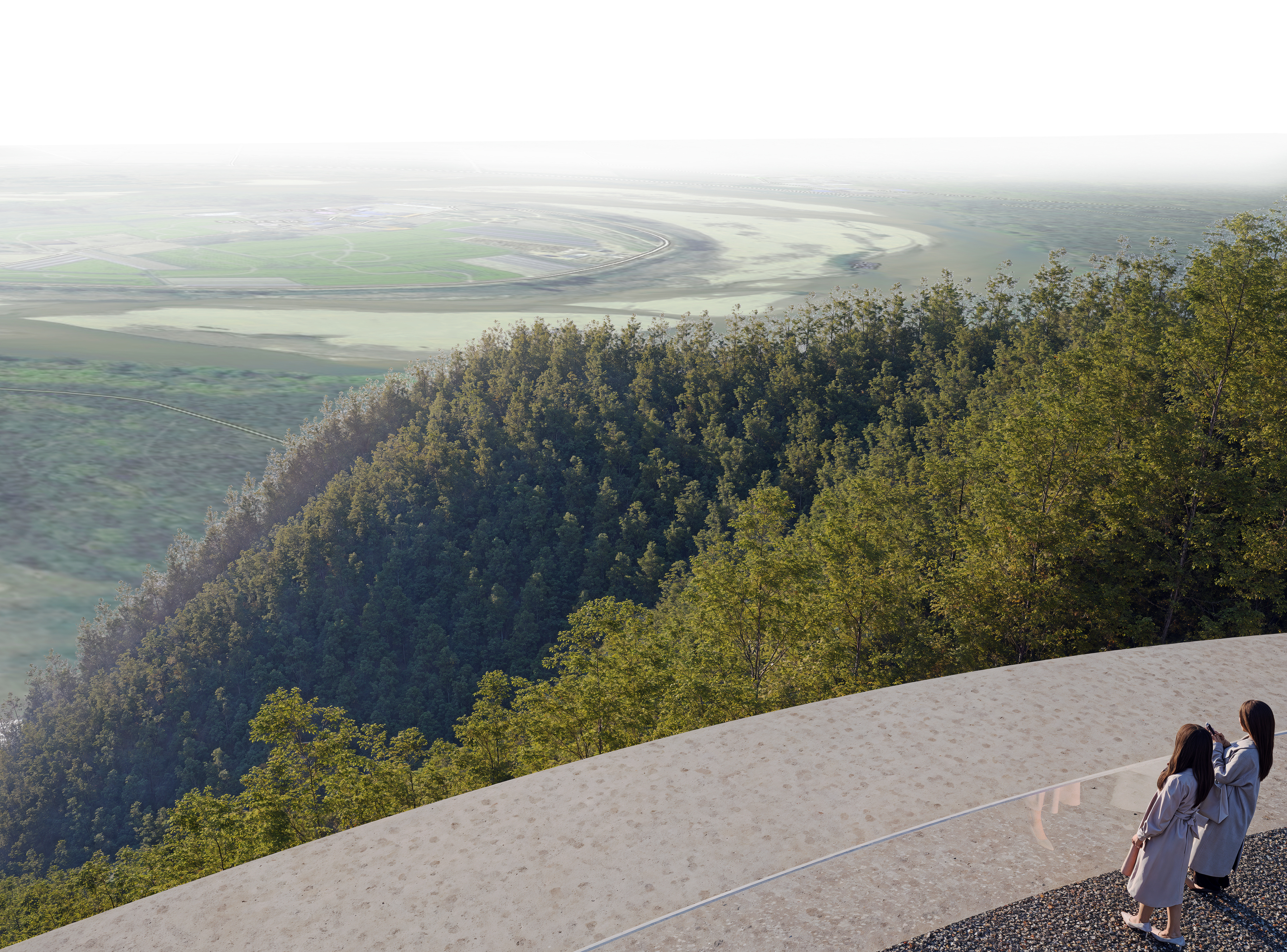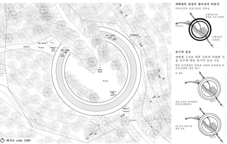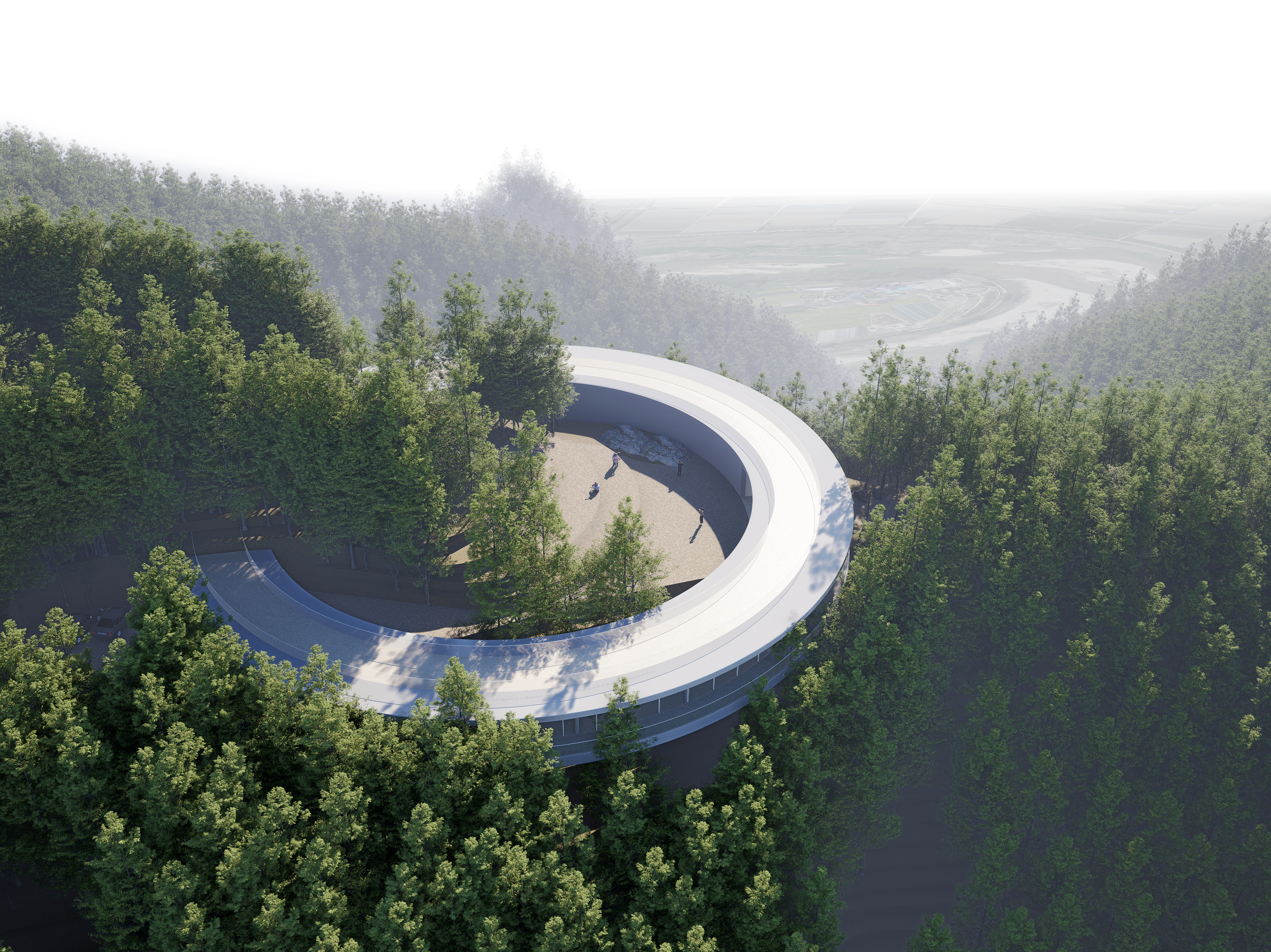 Le projet propose une forme qui préserve la silhouette naturelle du mont Biryeong, en tenant compte de l'harmonie entre la nature et l'architecture. La plateforme circulaire et horizontale s'intègre naturellement au paysage et offre une vue panoramique à 360 degrés sur Hoeryongpo, le complexe culturel Samgang et Mungyeong. L'impact au sol est réduit afin de minimiser les perturbations environnementales, et la disposition privilégie une interaction fluide entre l'architecture et la nature.