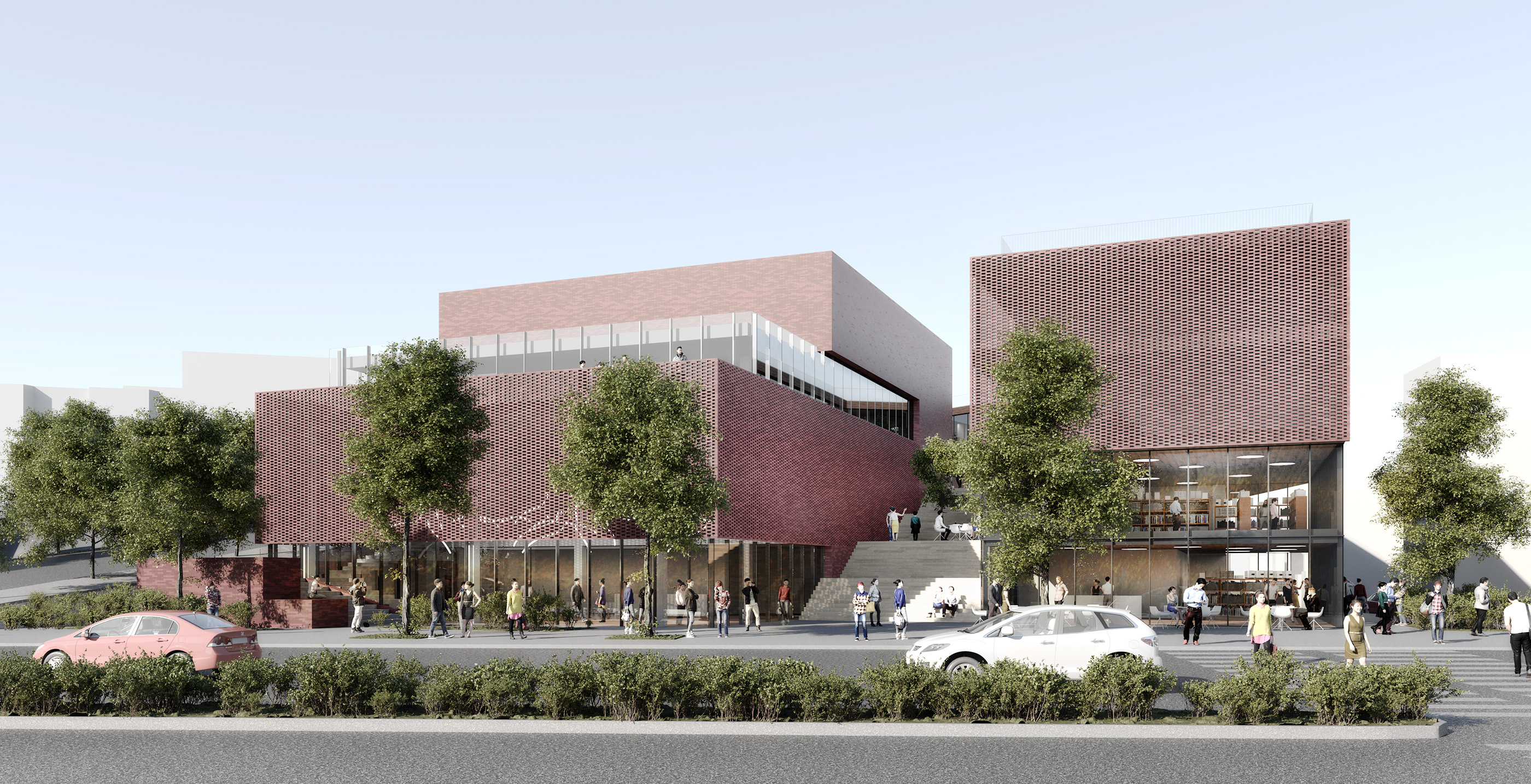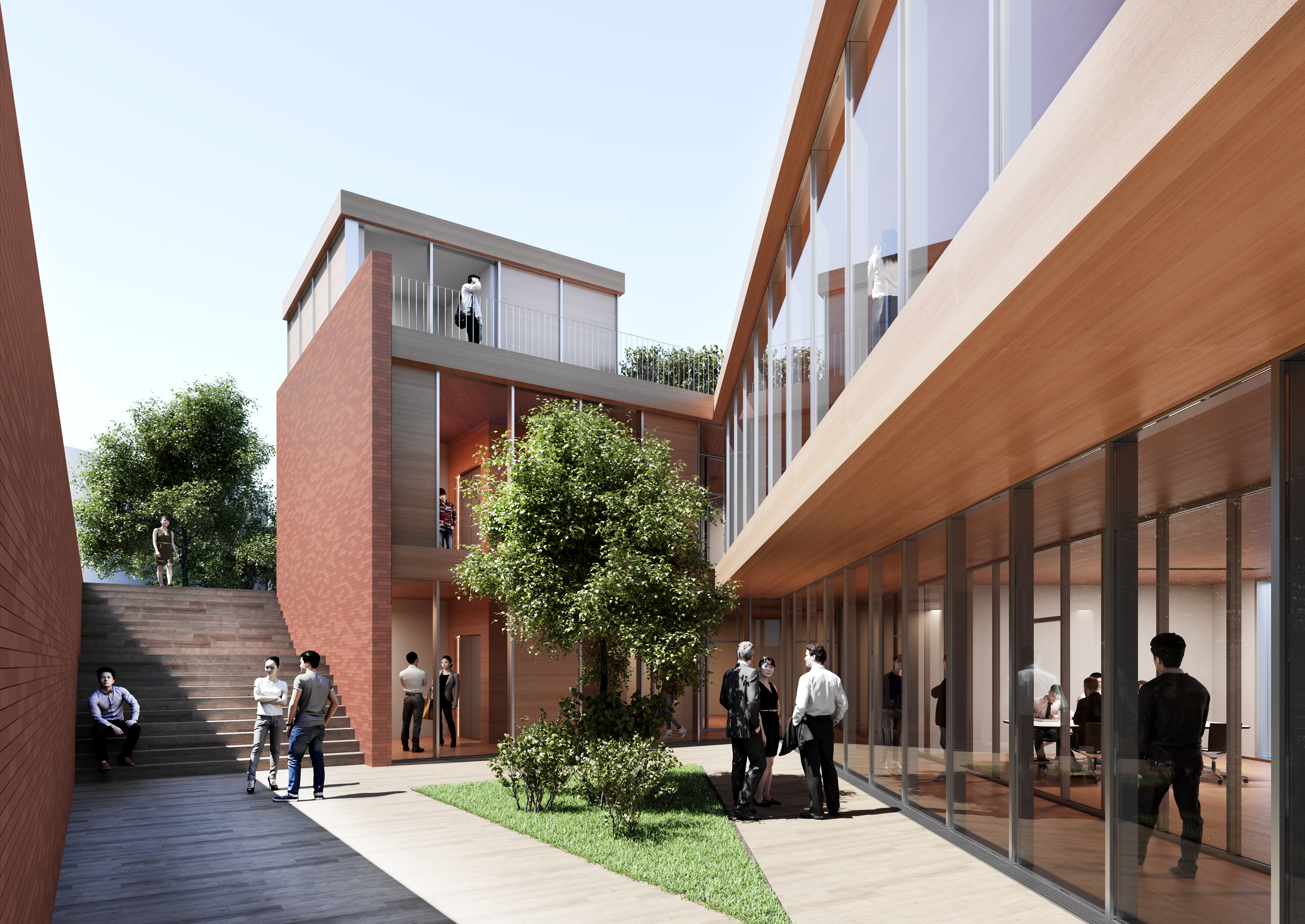 La terrasse du 2e étage relie des espaces tels que des salles de théâtre, des salles de séminaire, des bureaux pour le centre de soutien et des bureaux à louer pour des associations, favorisant les échanges entre le grand public et les professionnels.