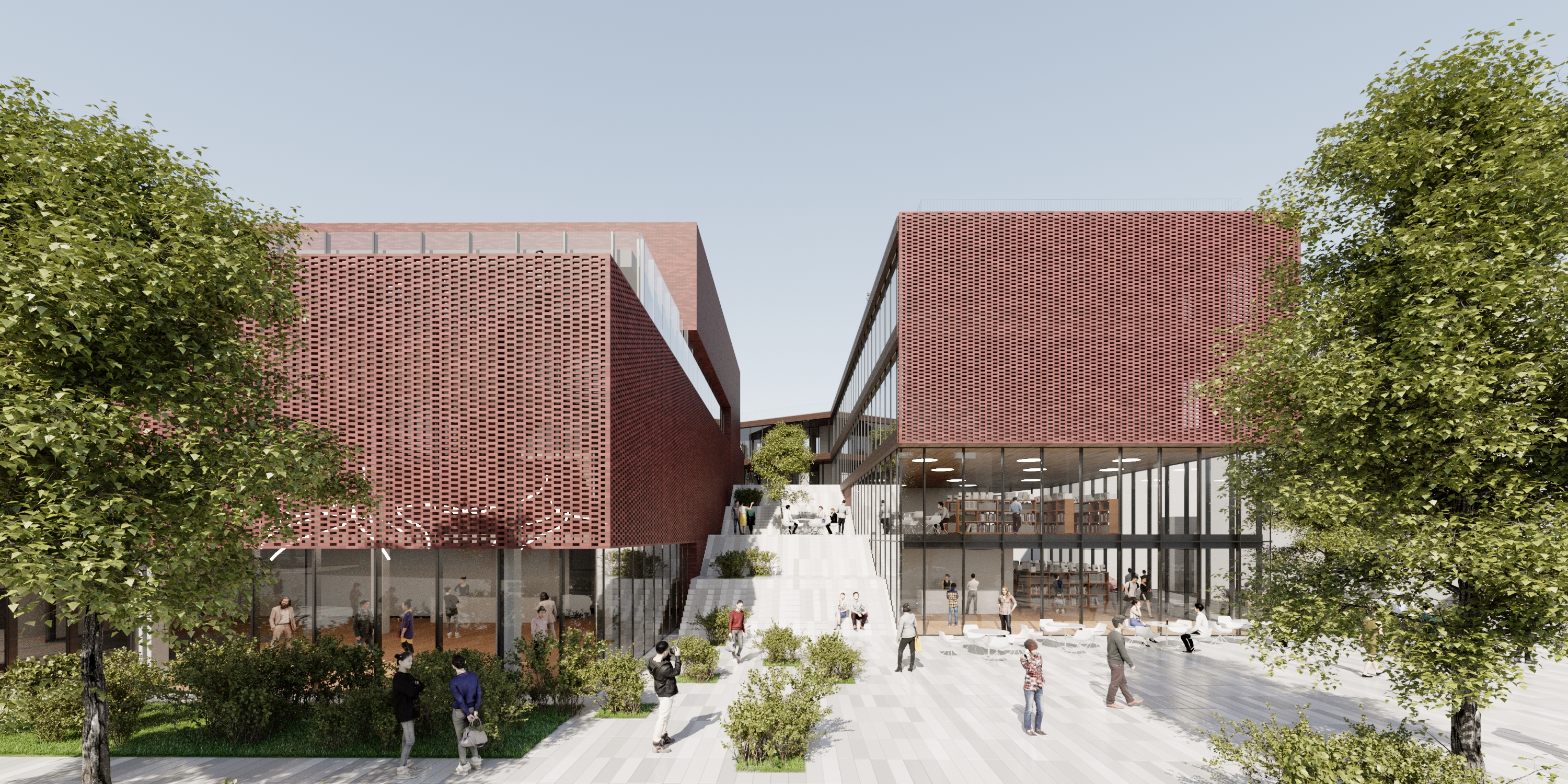 Le chemin piétonnier est relié à des espaces extérieurs interagissant avec les programmes répartis sur plusieurs niveaux :