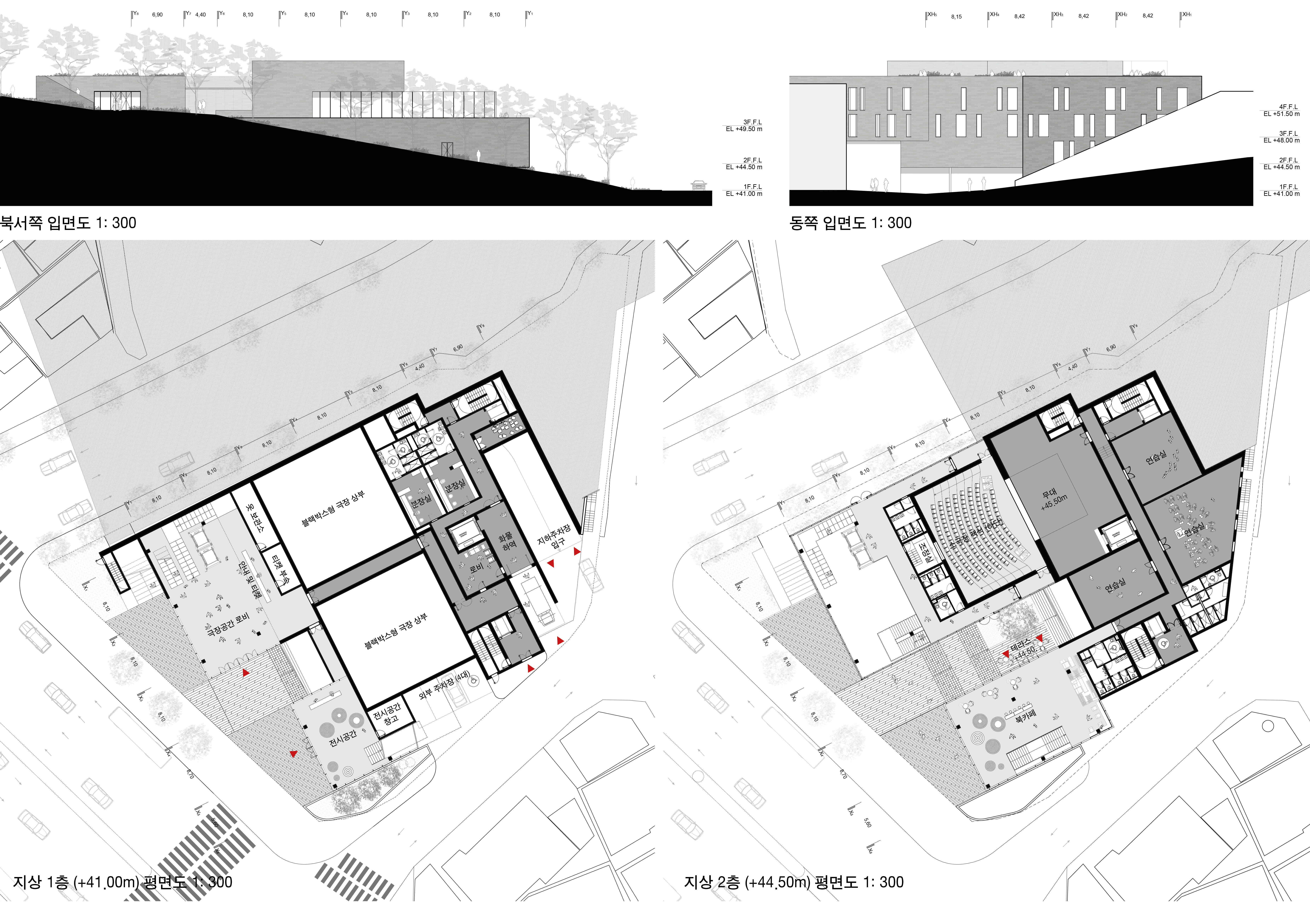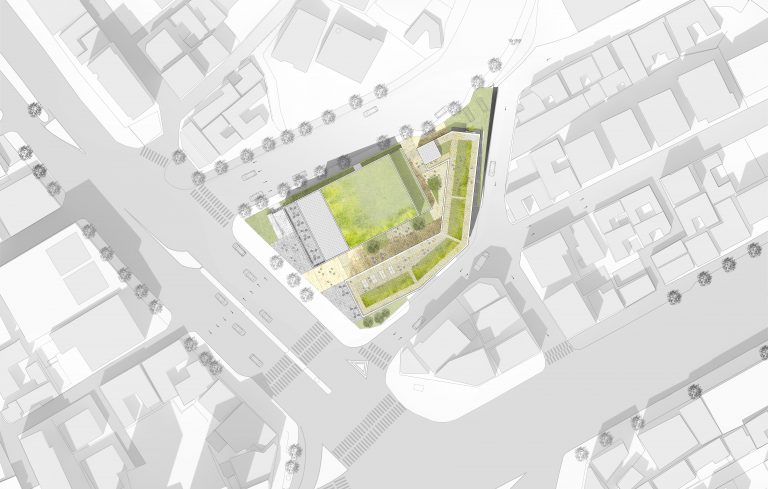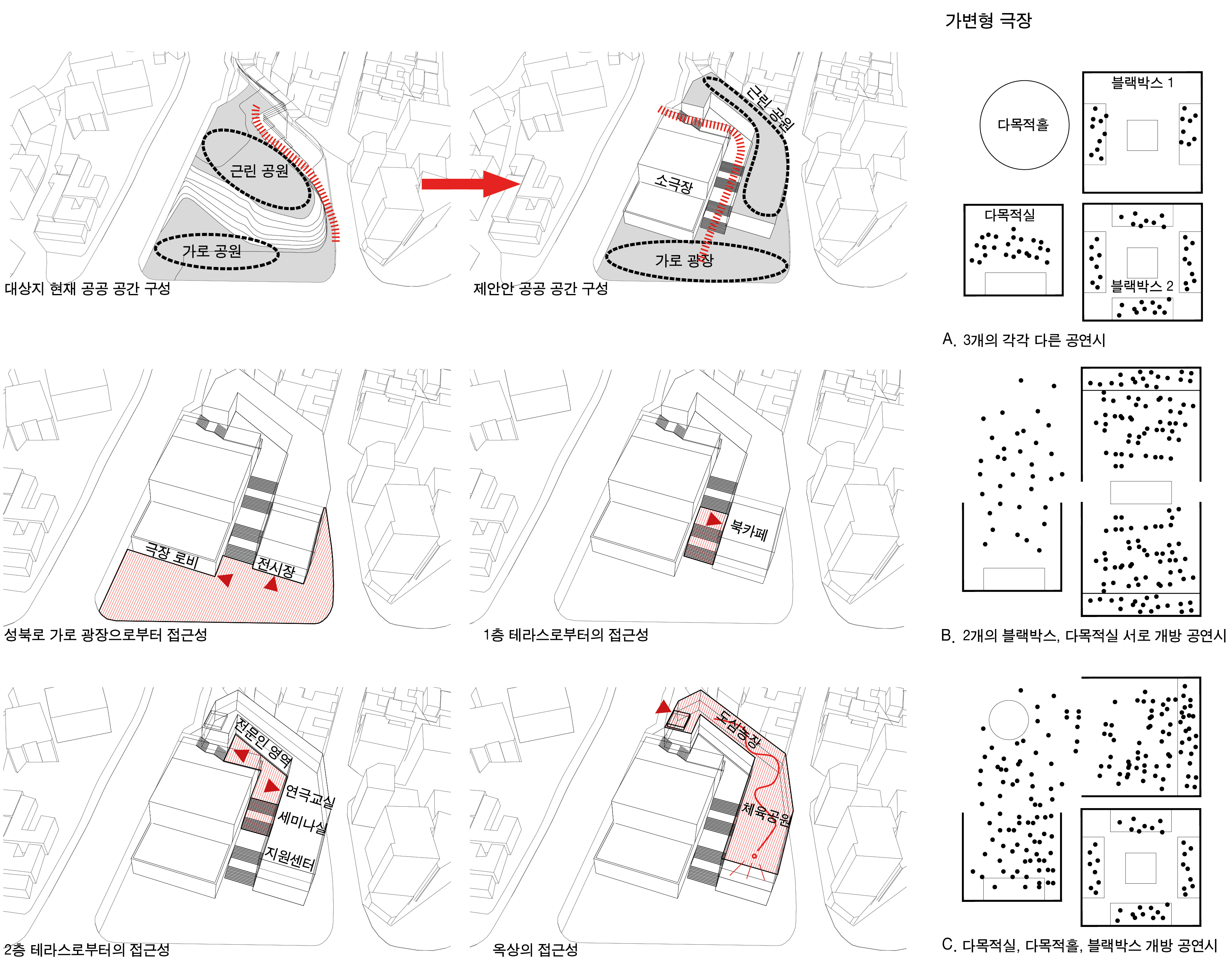 Le site est situé sur une pente avec une différence d'altitude d'environ 12 mètres vers le nord-est, comprenant un parc de quartier, un arrêt de bus et une route de circulation de 6 mètres de large. La proposition vise à restructurer ces trois éléments publics en association avec les programmes d'espace du “Centre de Théâtre”, afin de favoriser l'interaction et la coexistence entre les artistes, les habitants et les visiteurs.