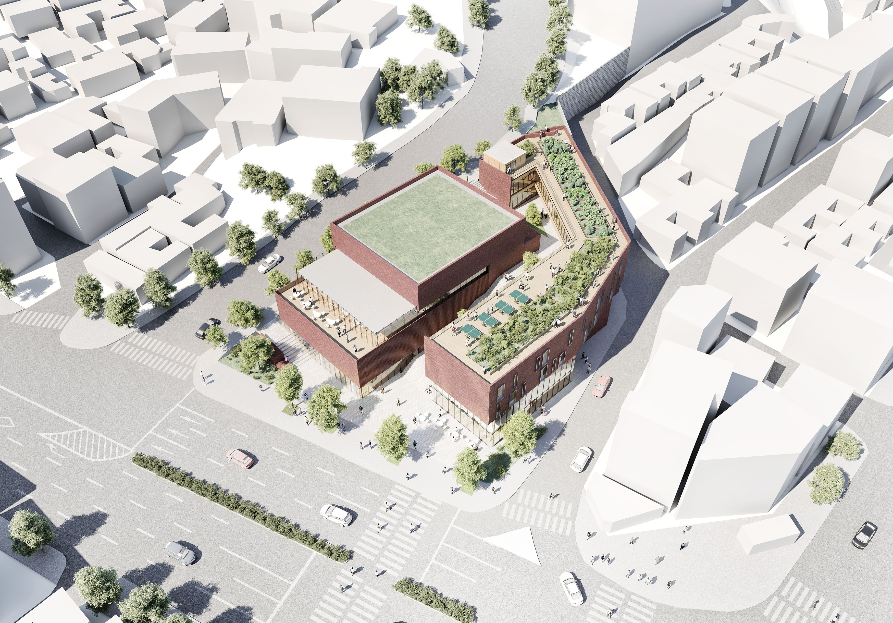 Le jardin du toit au 3e étage est conçu comme un jardin urbain et un parc sportif, accessible non seulement aux professionnels du théâtre mais également aux habitants et aux citoyens.