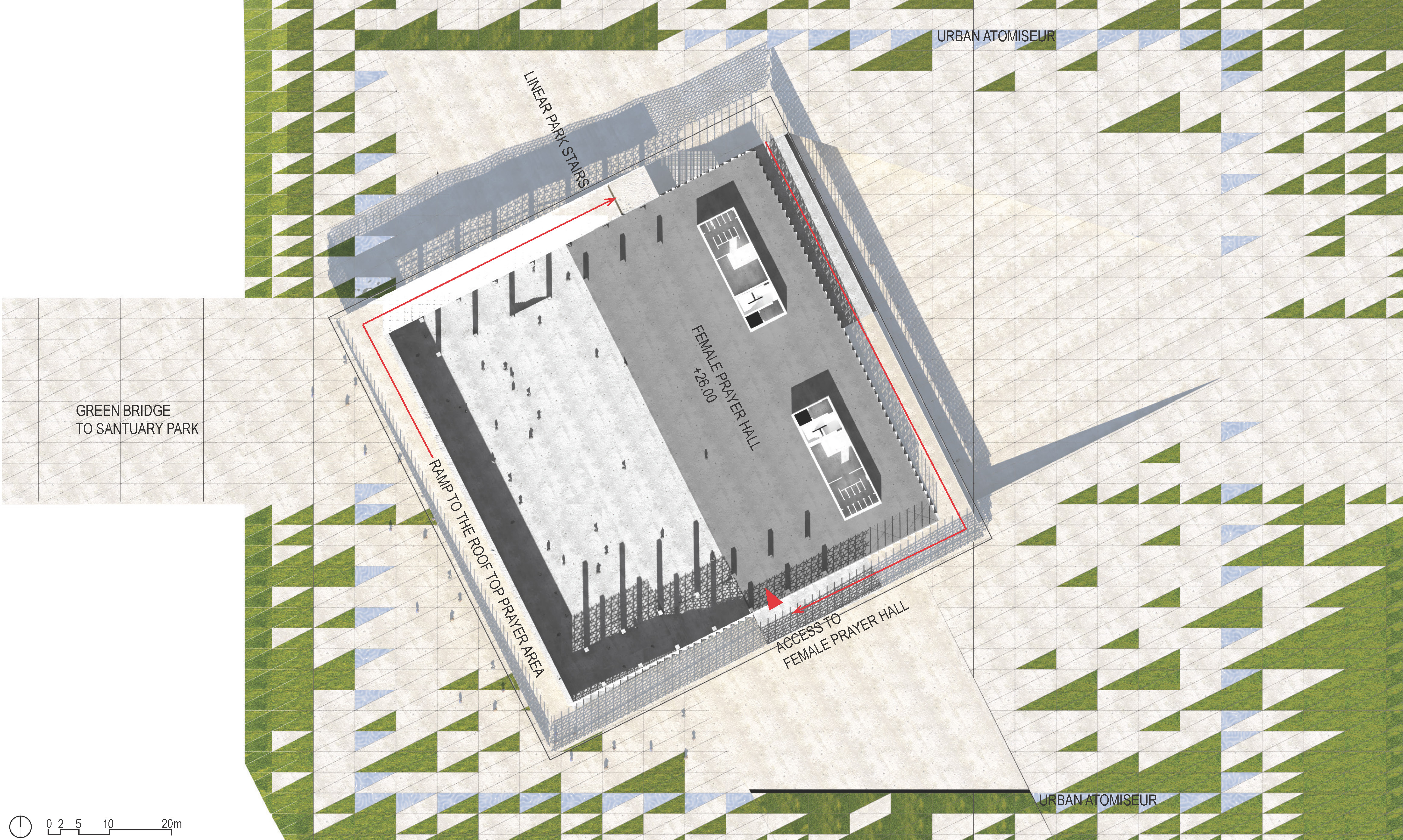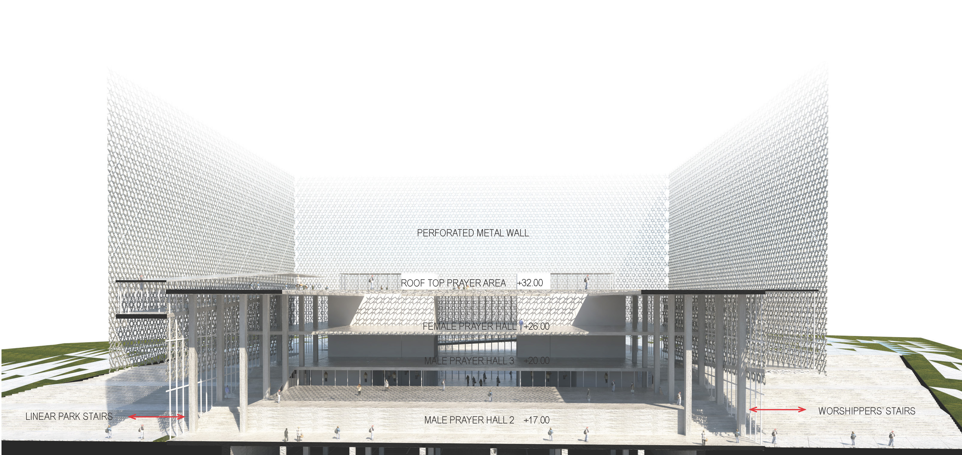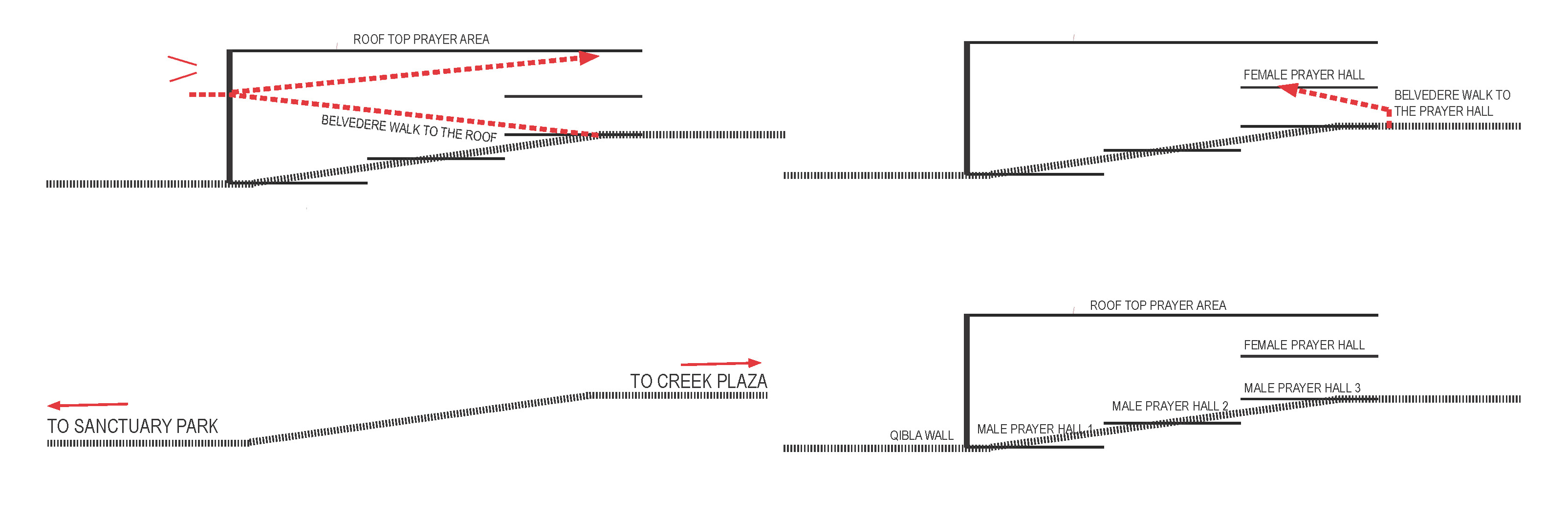 Les salles de prière principales se répartissent sur trois niveaux distincts, intégrées de manière harmonieuse dans le parcours urbain. Ces espaces partagent une ouverture exceptionnelle, étant reliés tant à l'intérieur qu'à l'extérieur. Un parvis incliné, en forme de triangle, s'ouvre face à la Plaza du Creek, accueillant non seulement les fidèles, mais également les visiteurs curieux, offrant ainsi un accès direct aux espaces publics tels que la bibliothèque et les salles d’enseignement coranique situées au niveau inférieur.