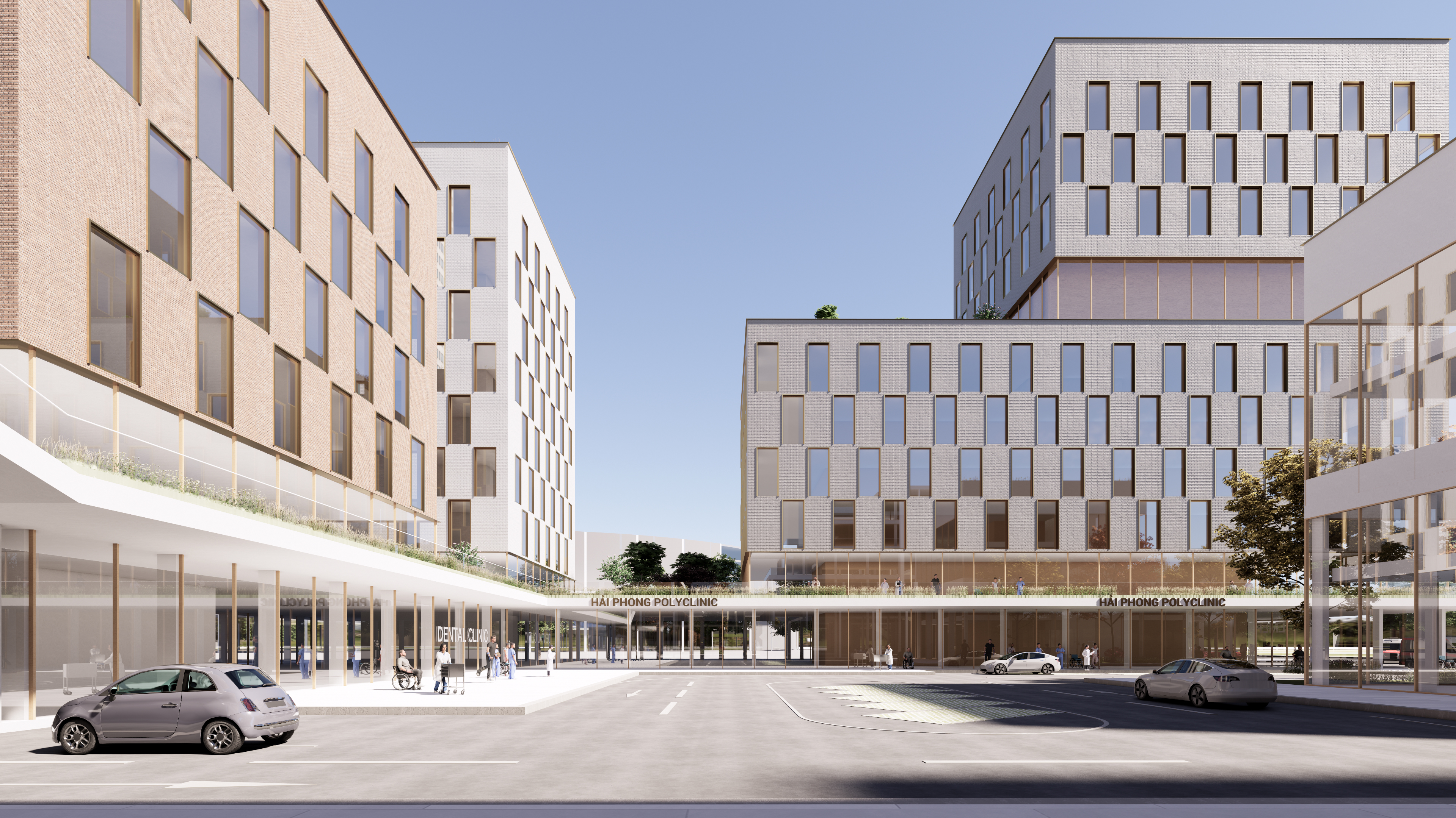 La polyclinique est composée de quatre bâtiments indépendants, chacun dédié à une fonction clinique spécifique, comme le centre pédiatrique, la dentisterie, la dermatologie et l'institut de recherche en ingénierie médicale. Le rez-de-chaussée, sous la « High Street », présente des façades vitrées, facilitant l’accès pour les visiteurs et les patients. Un espace vert commun, situé au deuxième étage, est relié à la « High Street », créant un lieu de repos accessible aux patients, visiteurs et employés de la clinique. Les façades en briques monolithiques avec des ouvertures régulières permettent à chaque bâtiment d’avoir une identité tout en restant cohérent avec l’ensemble.