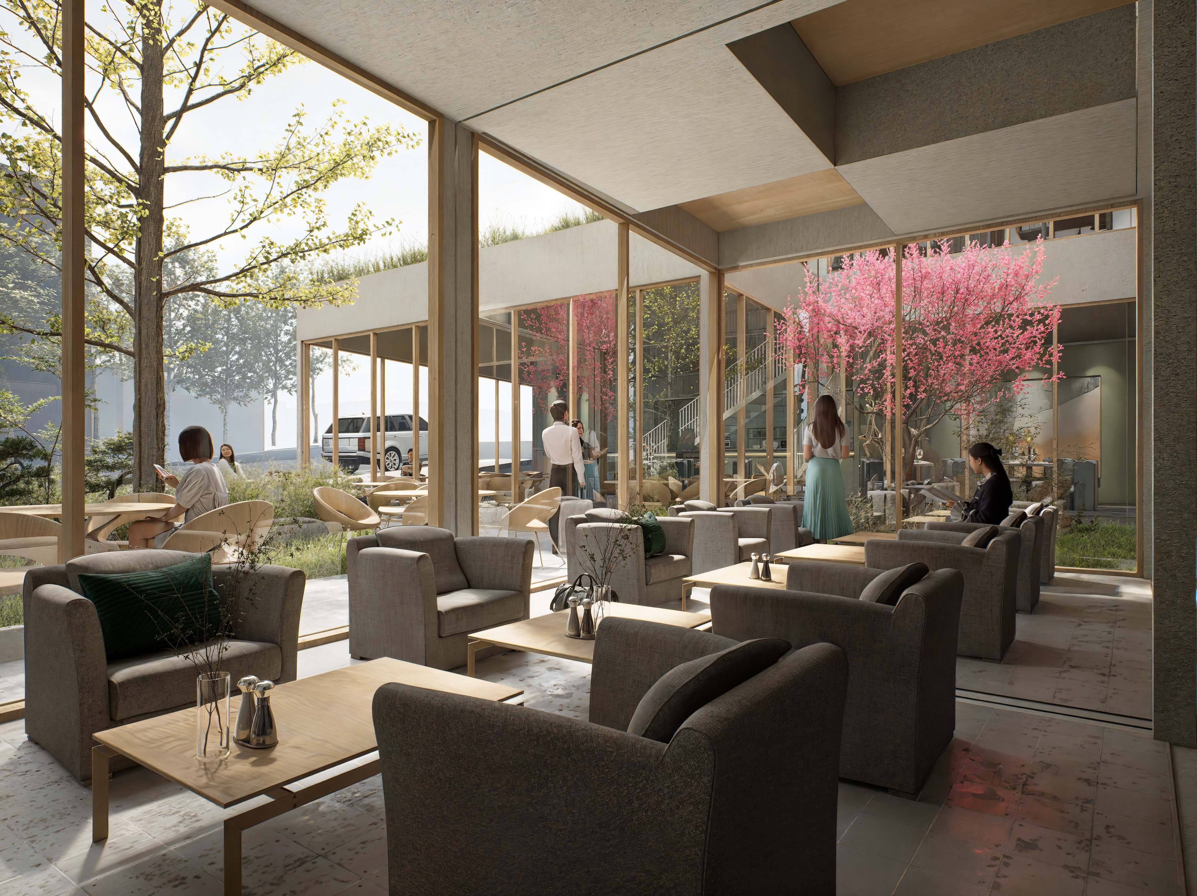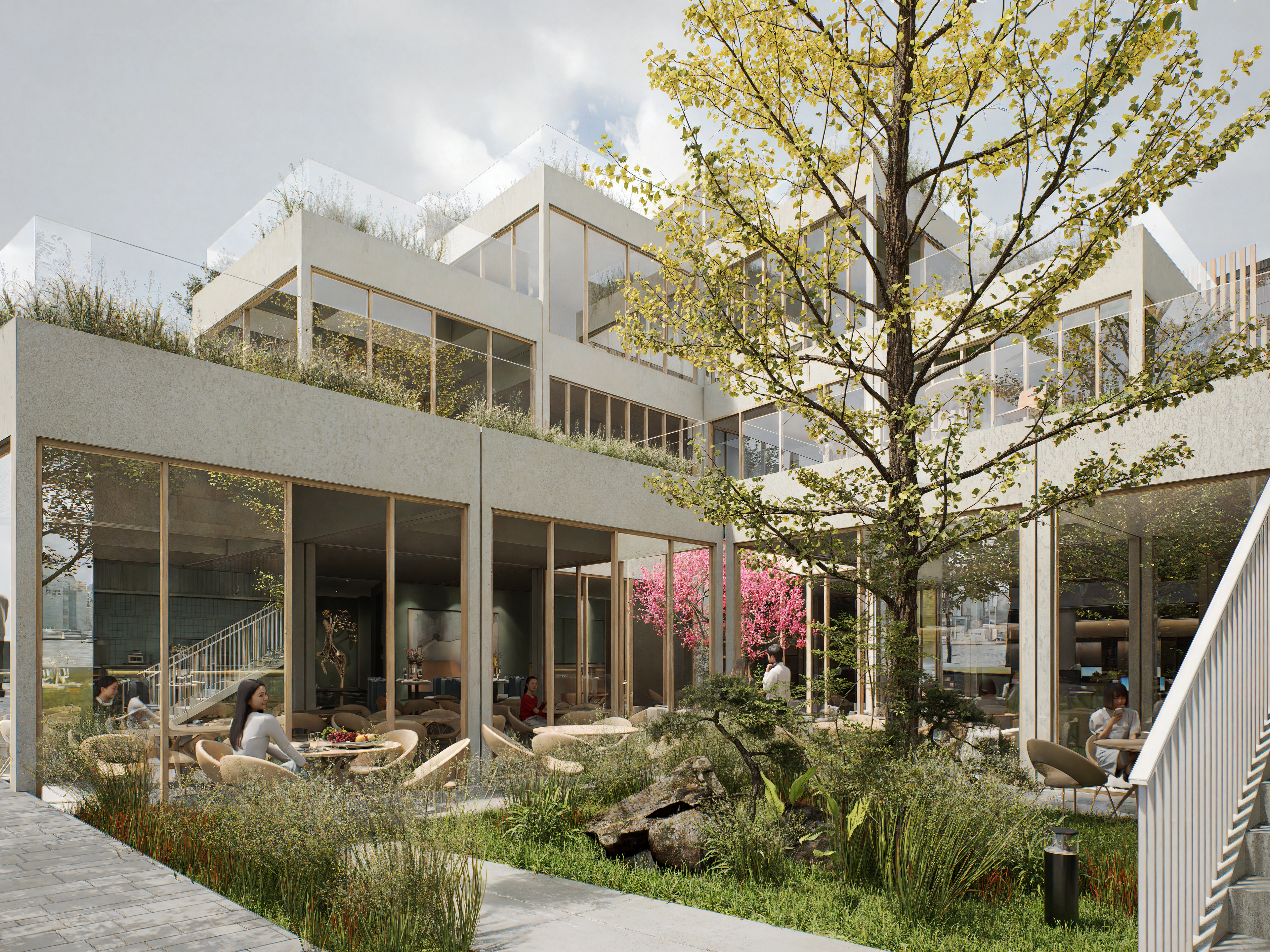 Ce projet intègre plusieurs fonctions interconnectées. Un parking bien conçu au sous-sol facilite l’accès aux résidents et visiteurs. Au rez-de-chaussée, un espace commercial de 330 m² répond aux besoins quotidiens des résidents et attire les visiteurs. Le premier étage propose un bureau en open-space de 270 m², offrant un espace de travail moderne et collaboratif. Aux deuxièmes et troisièmes étages se trouvent des villas de 250 m², offrant un cadre de vie confortable pour les familles, avec une piscine sur le toit au quatrième étage pour les loisirs. Les différents programmes des niveaux sont reliés de manière naturelle par un escalier extérieur et un noyau central, assurant une circulation verticale fluide. Chaque étage est orienté vers des jardins situés au sud-ouest, offrant lumière et verdure, et chaque espace s’articule autour d’un patio central qui crée une ambiance chaleureuse et sereine, tant pour les espaces commerciaux que pour les villas.