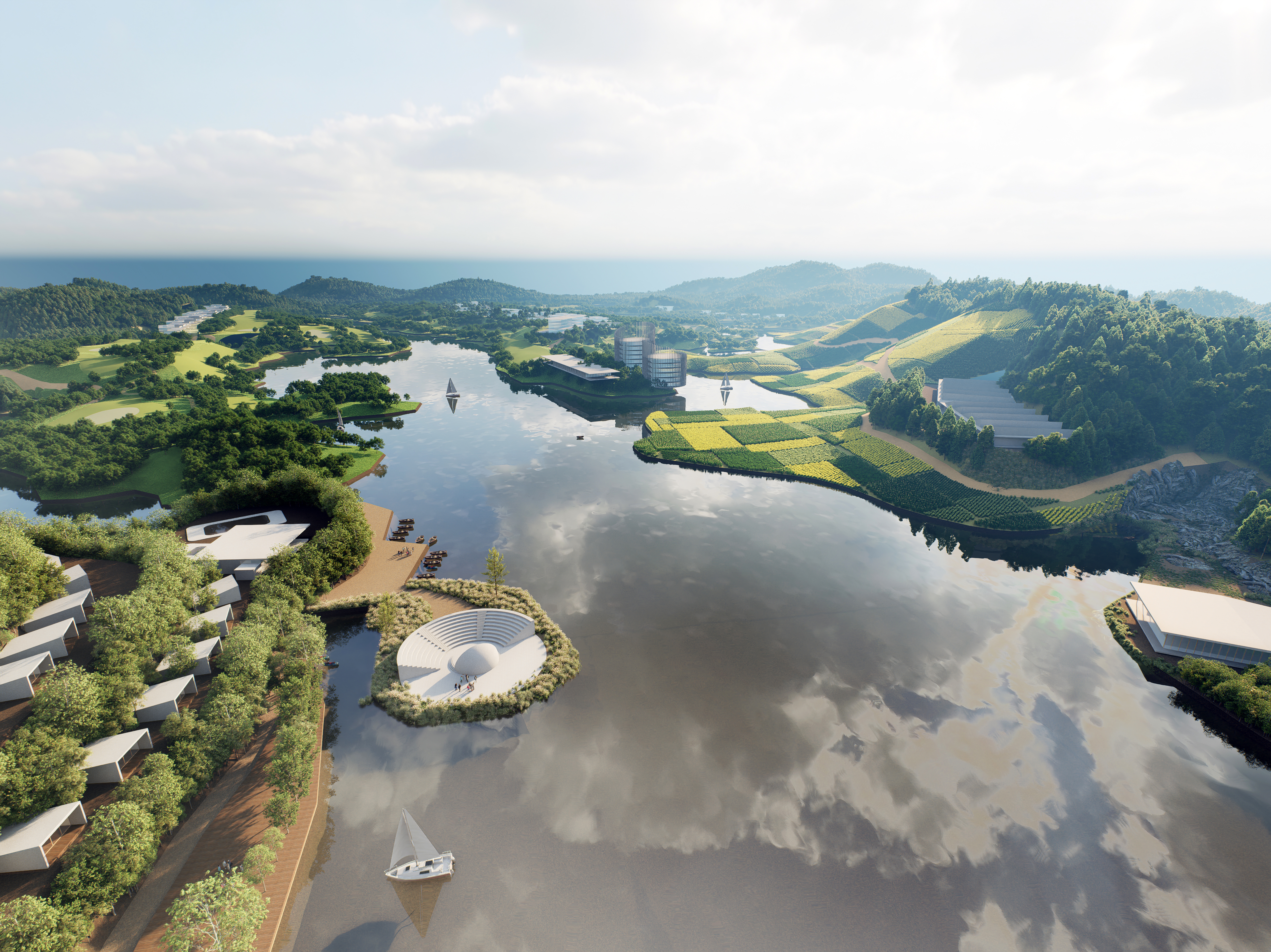Le plan prévoit également une scène de spectacle en plein air située au centre du lac. Cette scène est conçue pour être visible depuis plusieurs collines environnantes, permettant ainsi à un large public de profiter des événements. En suivant les sentiers pédestres de l'île, les visiteurs trouveront des cafés et des pubs en plein air, qui participent à l'animation de la vie culturelle du parc. Les zones de glamping, réparties sur les collines situées au nord et au sud de l'île, sont aménagées en respectant la pente naturelle du terrain. Cela permet de minimiser l'impact des travaux d'infrastructure et de préserver l’intégrité du paysage. Des activités nautiques sont également proposées le long des rives naturelles du lac, notamment à l’ouest. Les visiteurs de tout âge peuvent s’adonner à des activités telles que la pêche, le canoë et le motonautisme