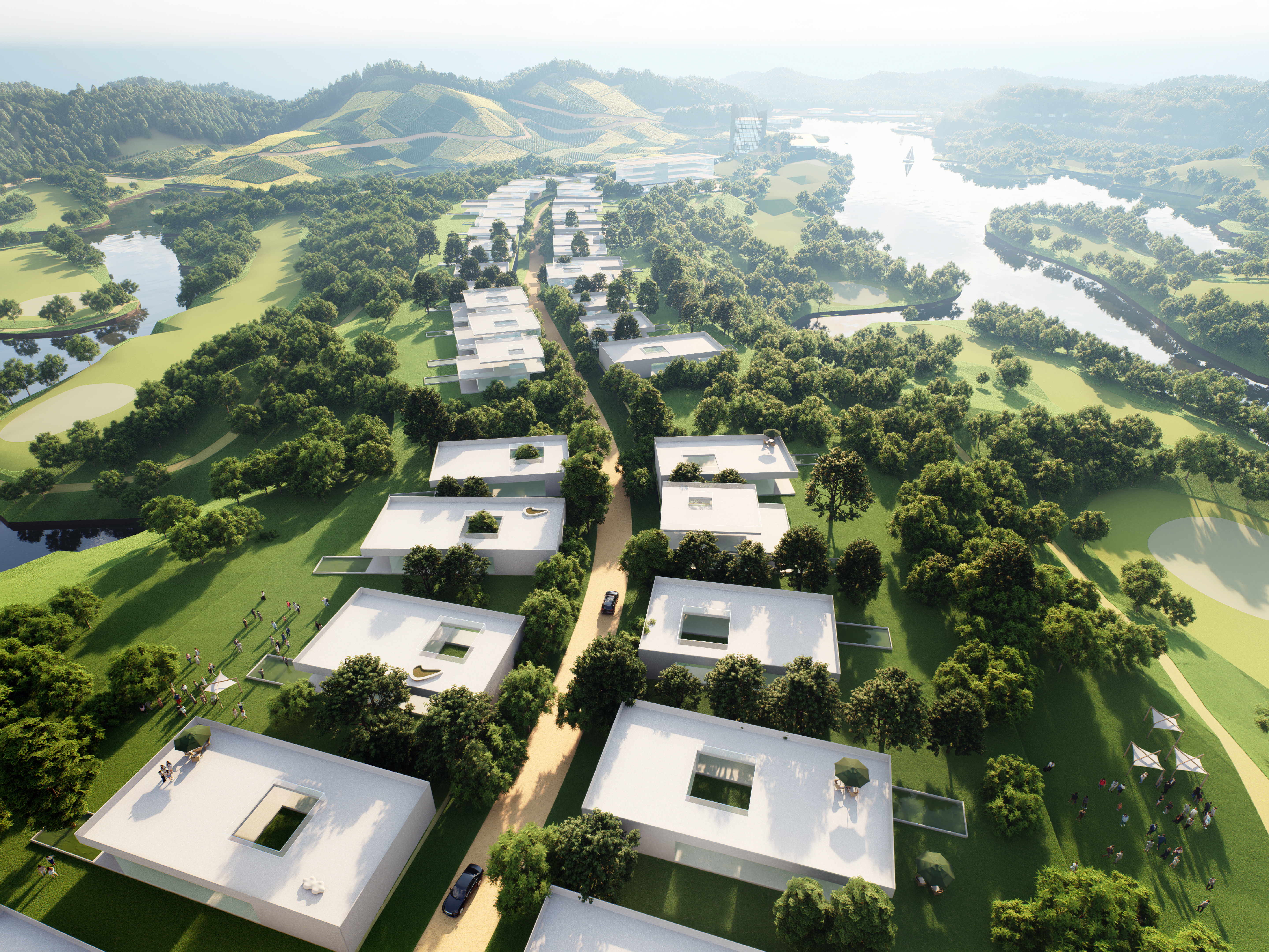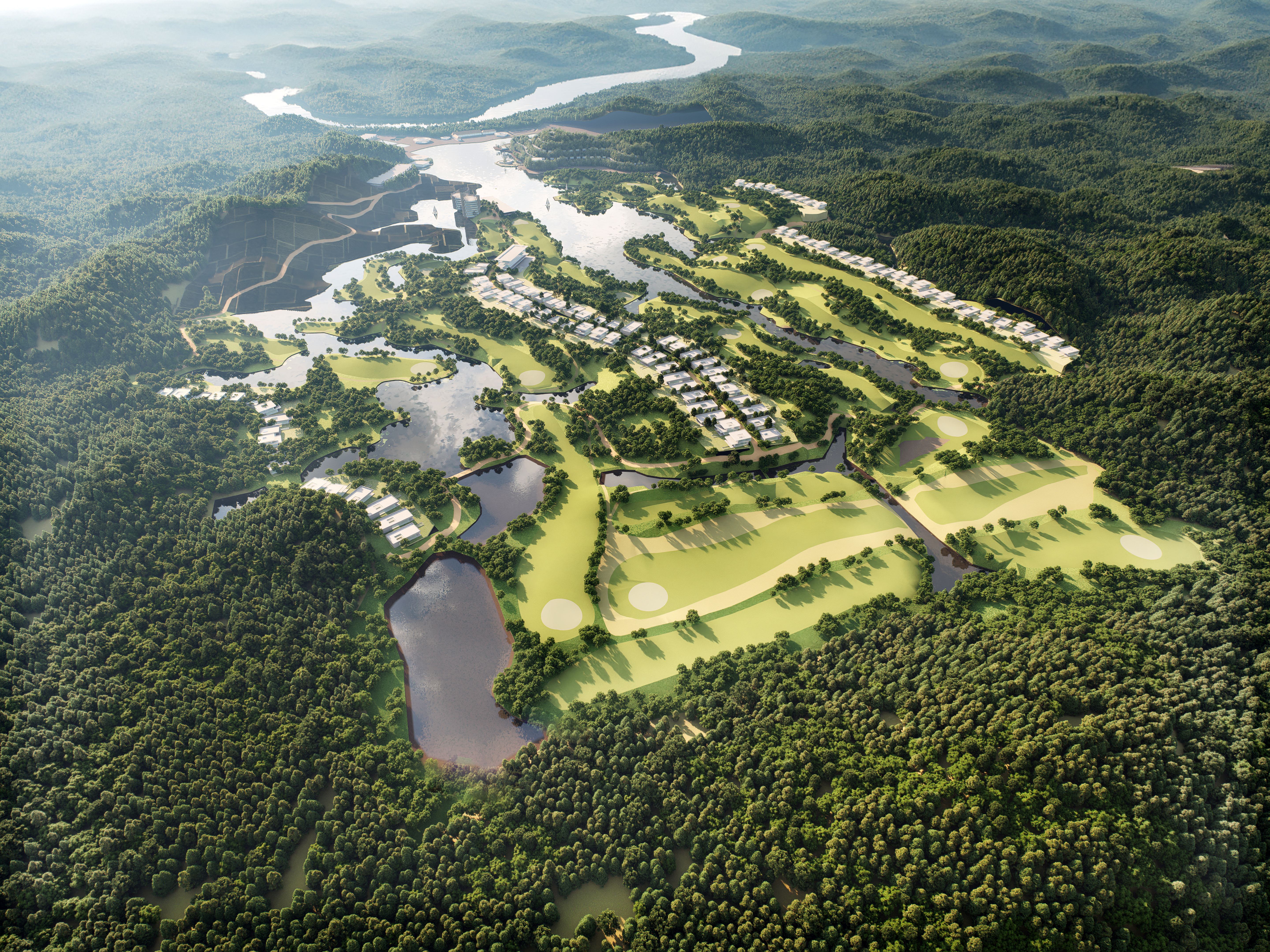 Enfin, un parcours de golf de 18 trous est prévu au sud du site, traversant le lac et les collines environnantes. Au centre du lac, sur l’île plus longue et plate, un club-house sera construit, autour duquel des condominiums et des villas privées seront positionnés sur les hauteurs. Ces résidences offriront une vue sur le parcours de golf et le paysage environnant, tout en s'intégrant de manière harmonieuse dans le relief naturel du site.