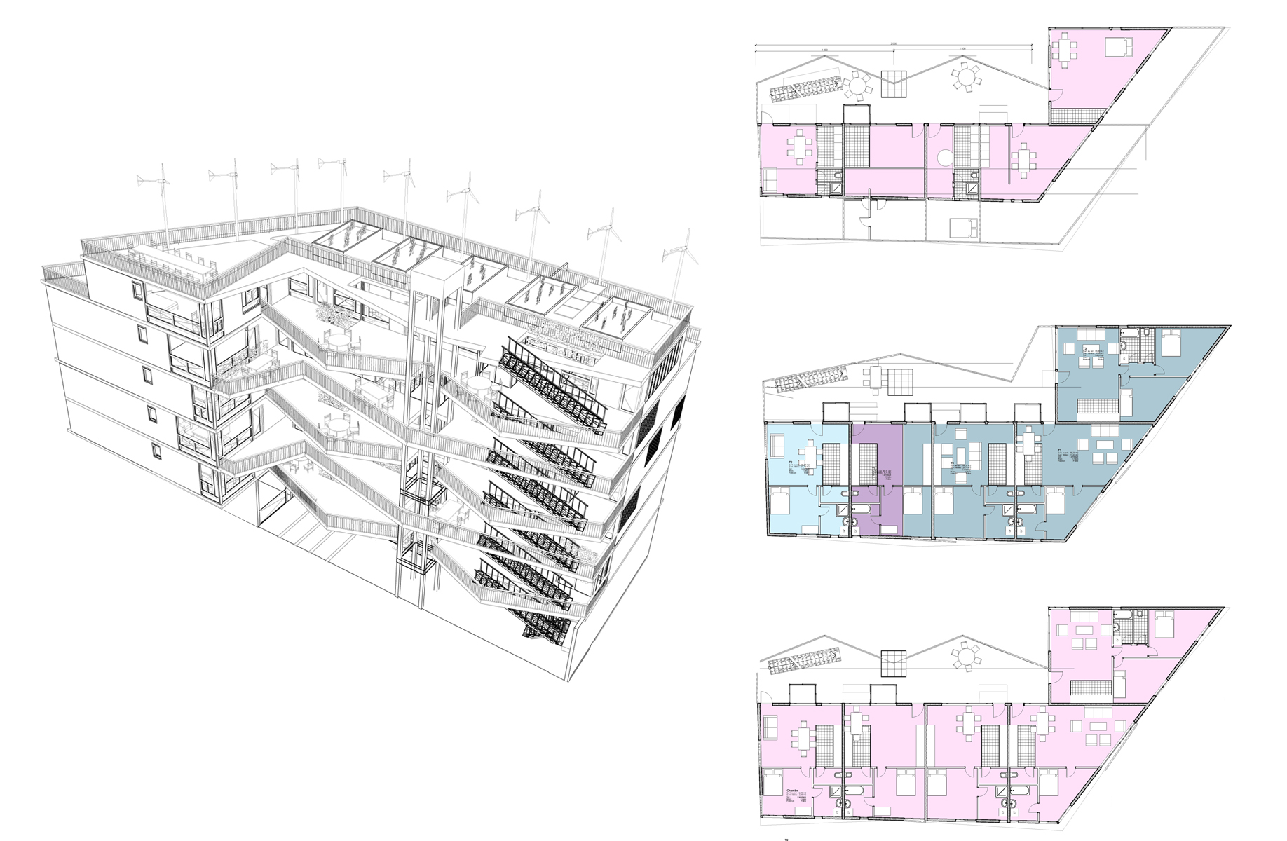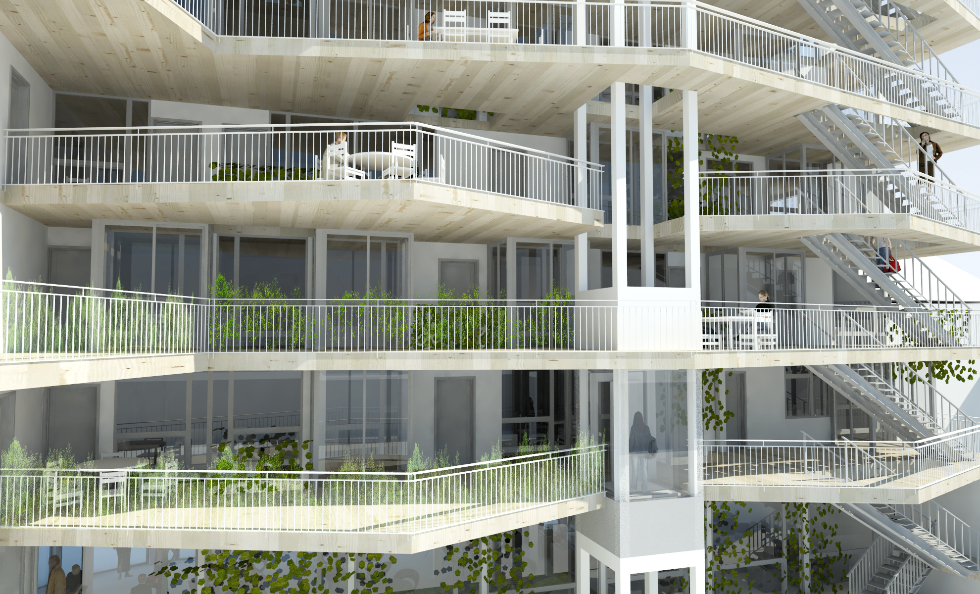 Reset Studio a proposé un habitat collectif dans lequel les espaces extérieurs sont partagés. La façade, orientée vers l’ouest, est entièrement constituée de coursives extérieures, offrant ainsi des fonctions variées. Ces coursives sont à la fois des voies de circulation, des espaces de rencontre pour les résidents, ainsi que des zones de jeu sécurisées pour les enfants. Ce lieu de passage favorise les interactions entre les habitants, devenant le cœur social du projet. Ces espaces facilitent la communication et renforcent la cohésion communautaire, permettant aux résidents de créer une communauté unie. Les logements sont conçus avec flexibilité et une atmosphère accueillante, et des espaces dédiés aux visiteurs permettent aux familles et amis de venir pour de courts séjours ou des moments de convivialité.