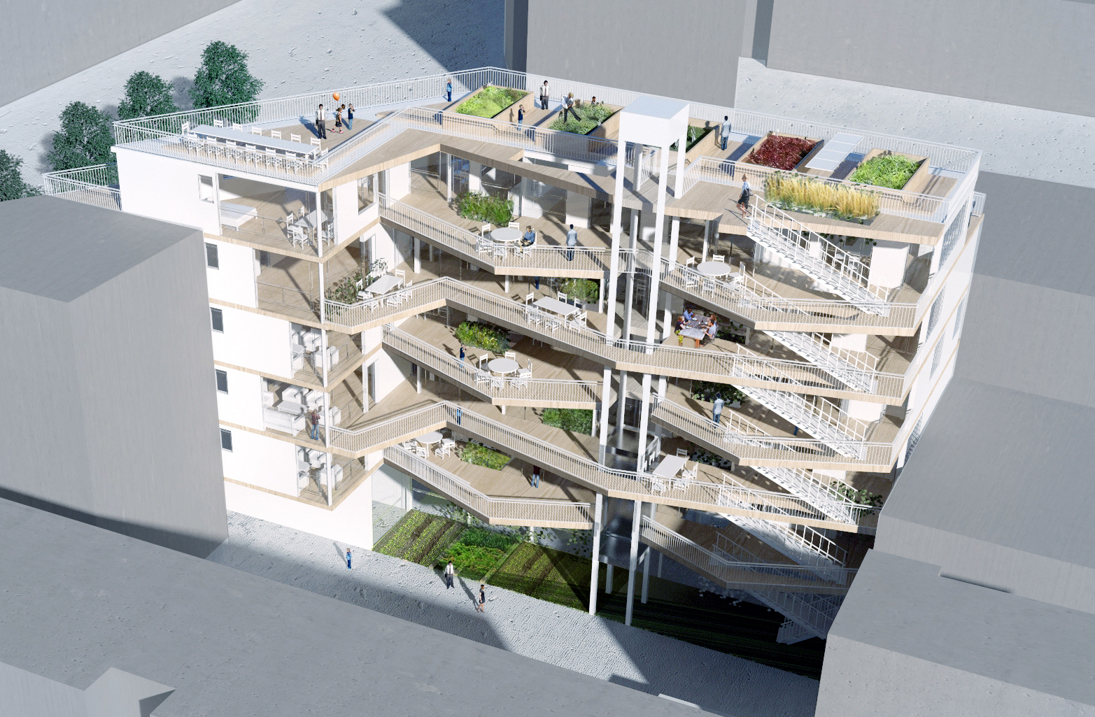 Le projet propose un habitat collectif innovant sur un terrain étroit à Montreuil, avec des espaces partagés tels que des coursives extérieures et un jardin sur le toit. Ce concept favorise la convivialité, les échanges sociaux et la cohésion communautaire tout en respectant l’environnement.