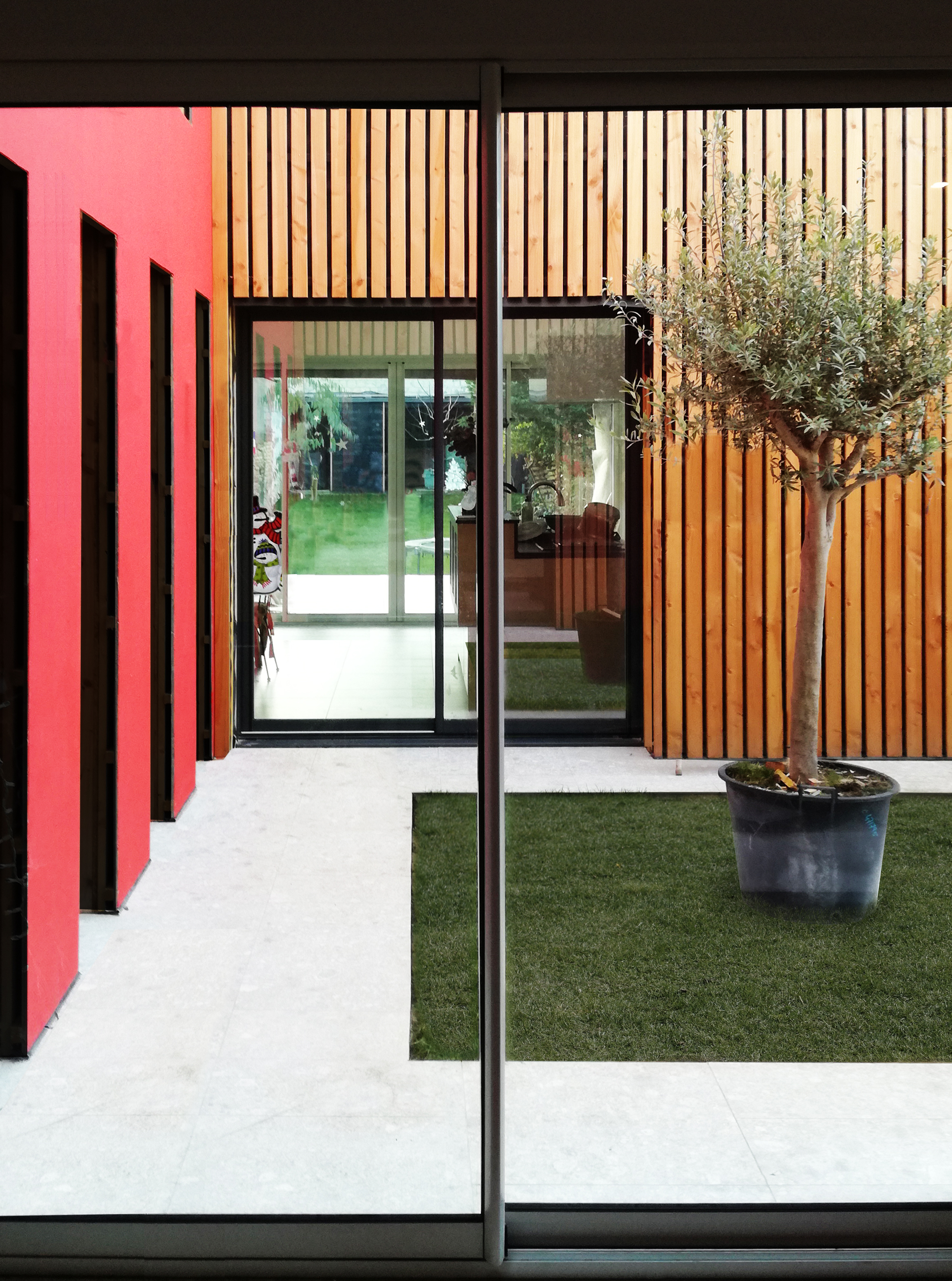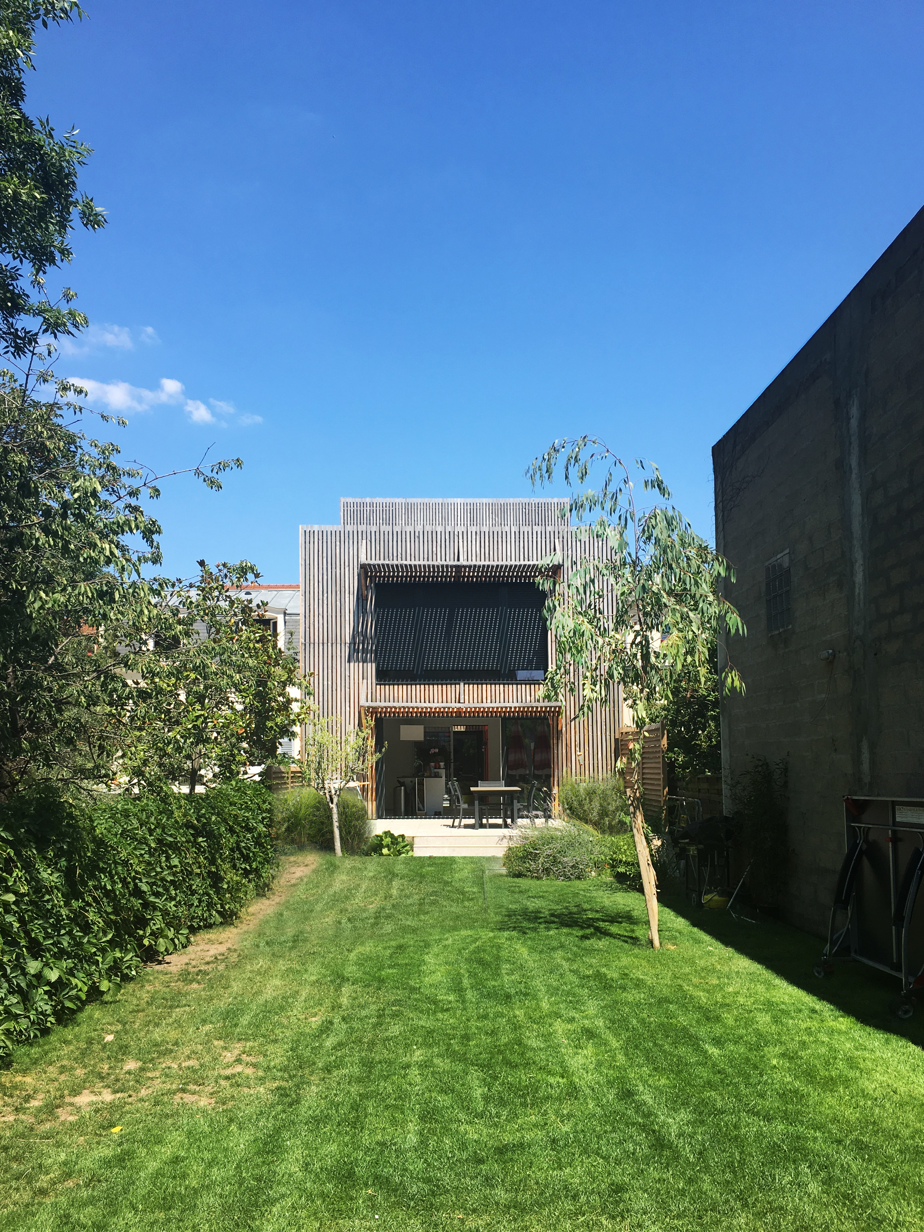 Ce projet de construction en bois est situé dans un quartier résidentiel de Nanterre et s'adapte à la forme étroite de la parcelle en divisant le bâtiment en plusieurs volumes, plutôt qu'en une seule structure. Cette conception permet à chaque pièce de bénéficier de la nature, de l'air frais et de la lumière naturelle. Dès l'entrée, un patio, de grandes baies vitrées et un jardin au sud sont visibles, créant une harmonie entre la nature, la lumière et le vent à travers la maison, pour rechercher la simplicité par le biais de la nature.