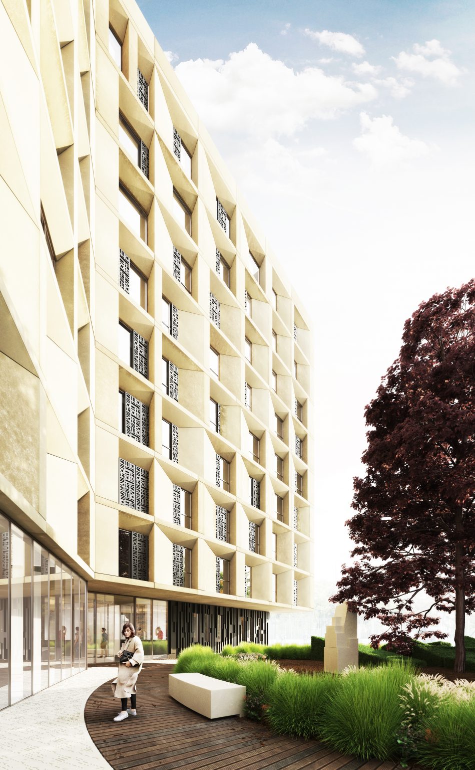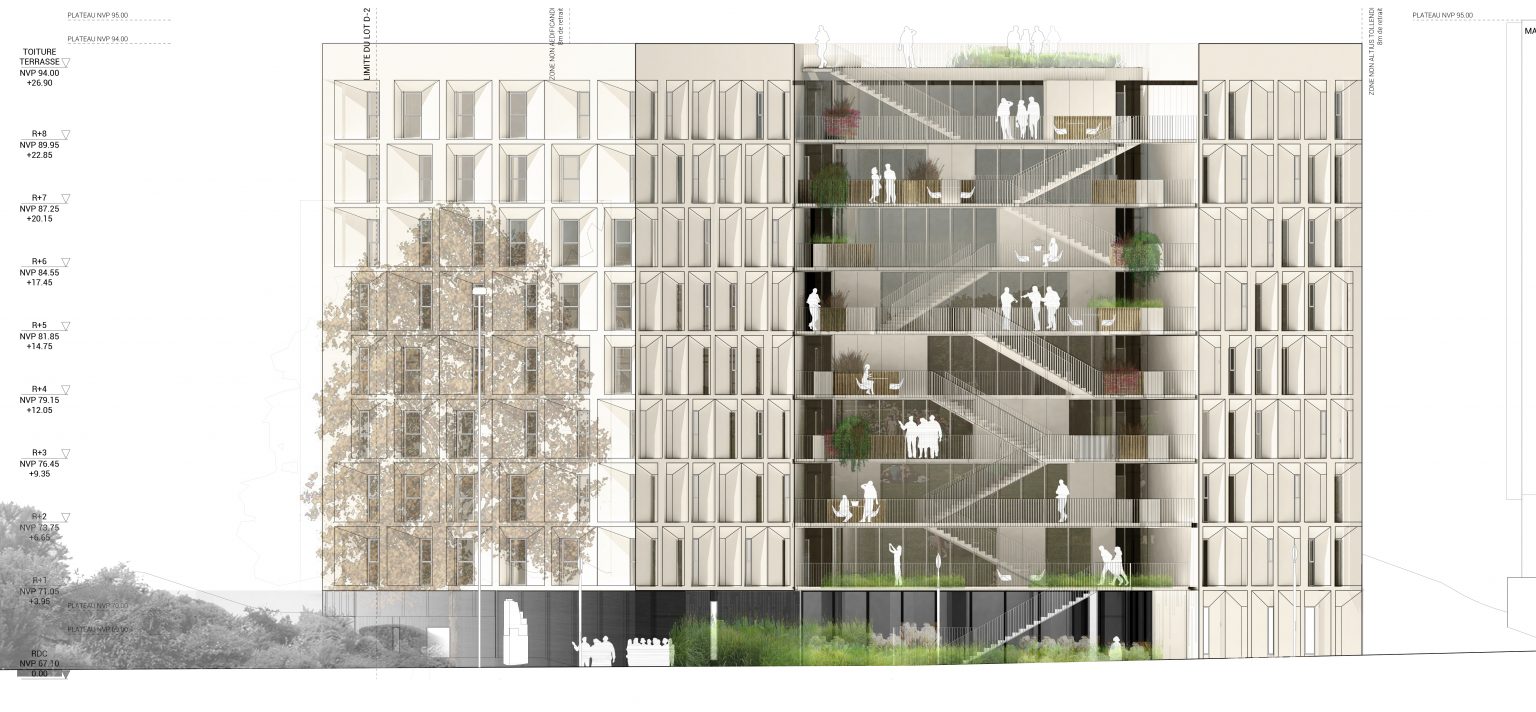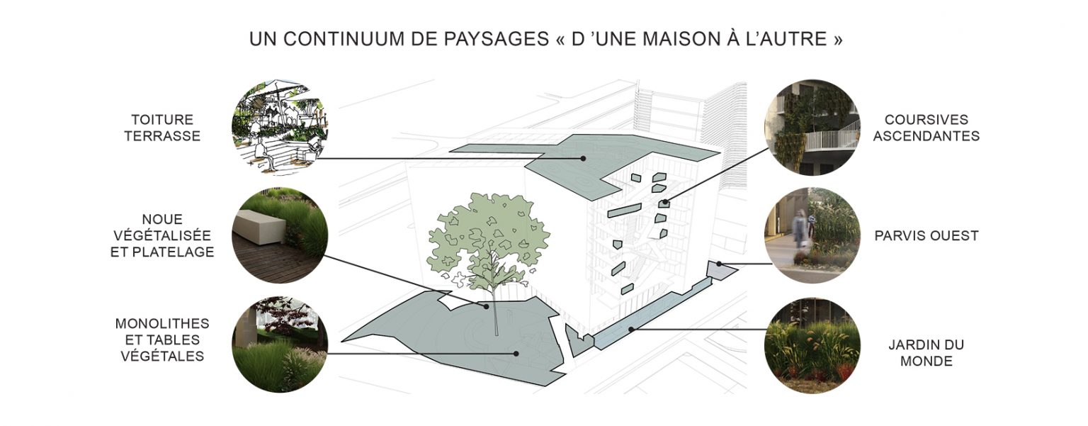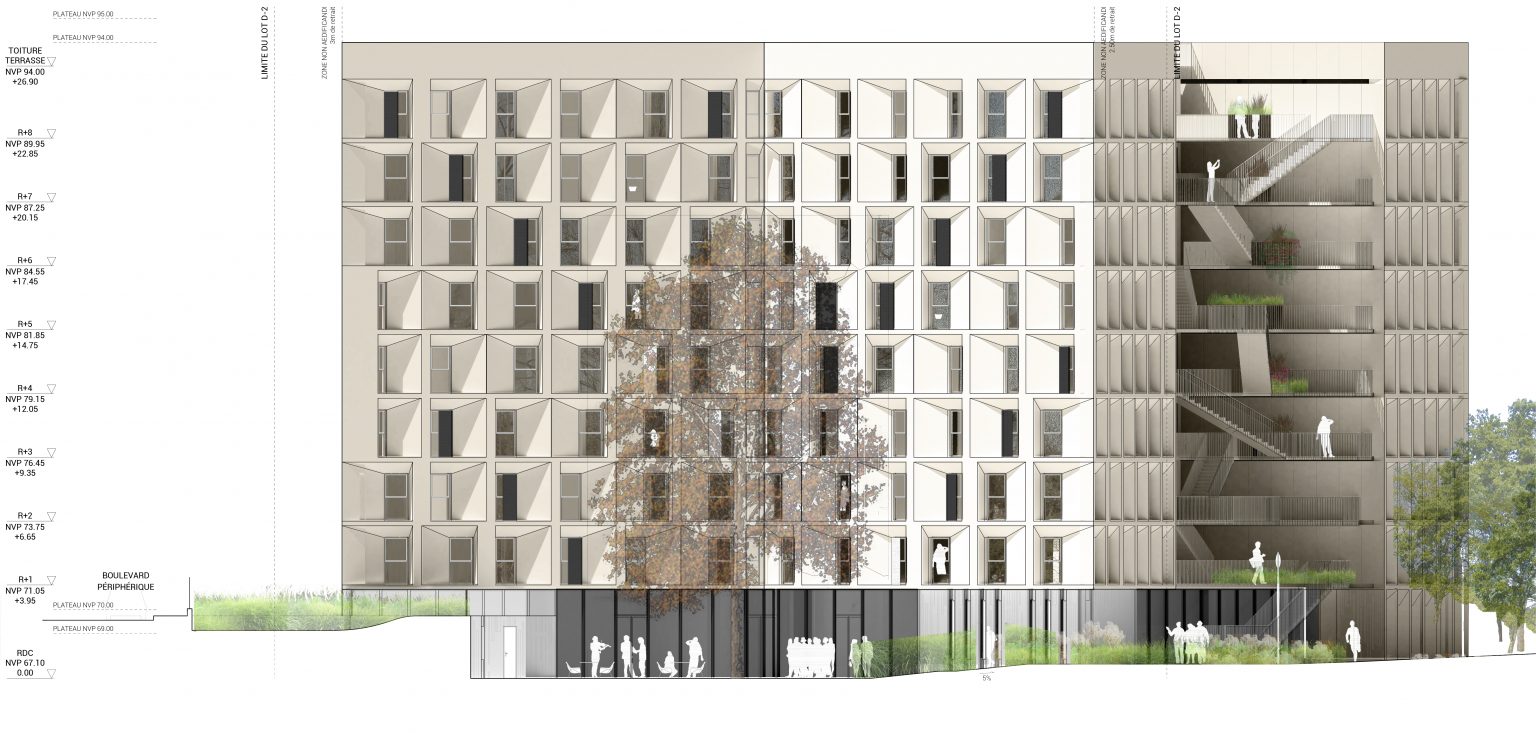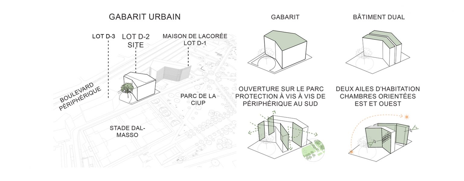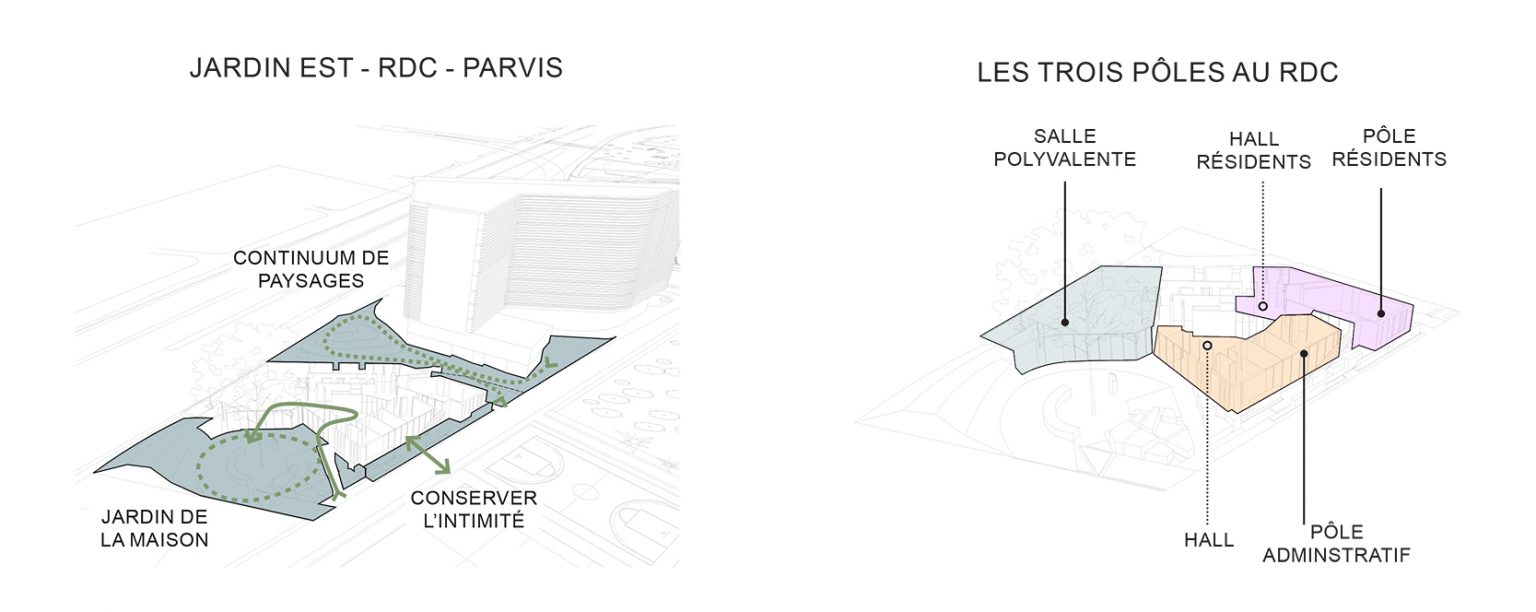 Le projet s’articule autour de deux ailes principales. À l’est, l’aile s’adosse au jardin du monde, tandis qu’à l’ouest, elle longe un parvis partagé avec la Maison de la Corée, lequel se prolonge en un talus végétalisé vers le périphérique. Ces deux volumes inclinés définissent des espaces résidentiels intimes, tandis qu’un espace central, pensé comme un noyau de liaison et d’échange, relie ces deux entités. Ce volume central s’épanouit en direction du nord, offrant des vues dégagées sur le parc et favorisant une relation fluide avec l’environnement extérieur.