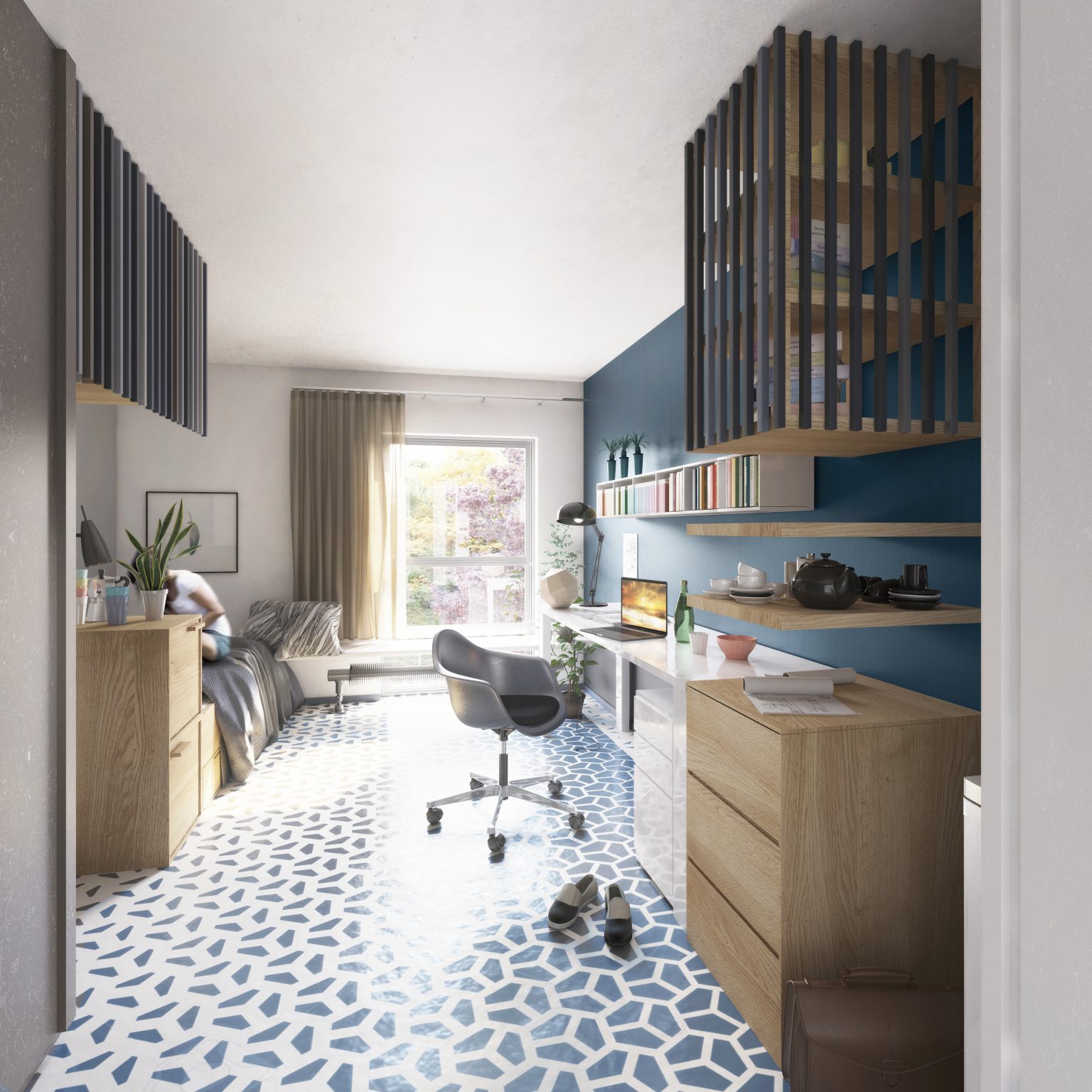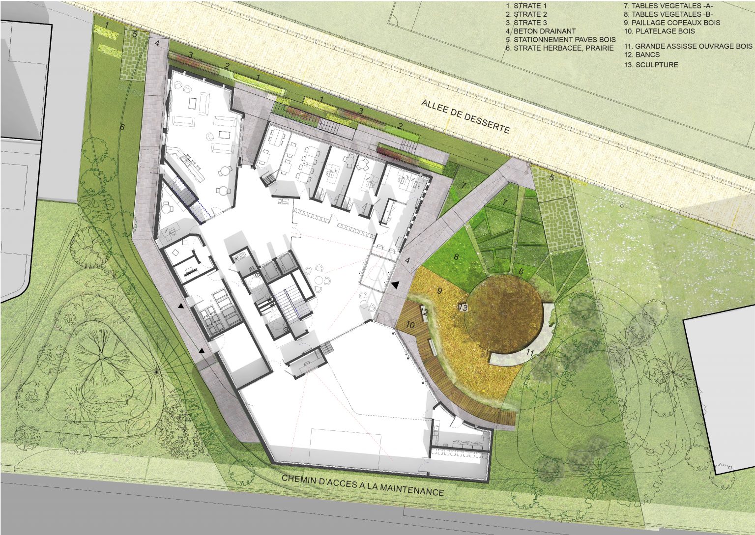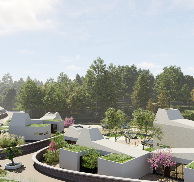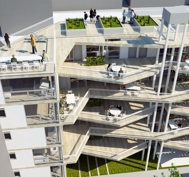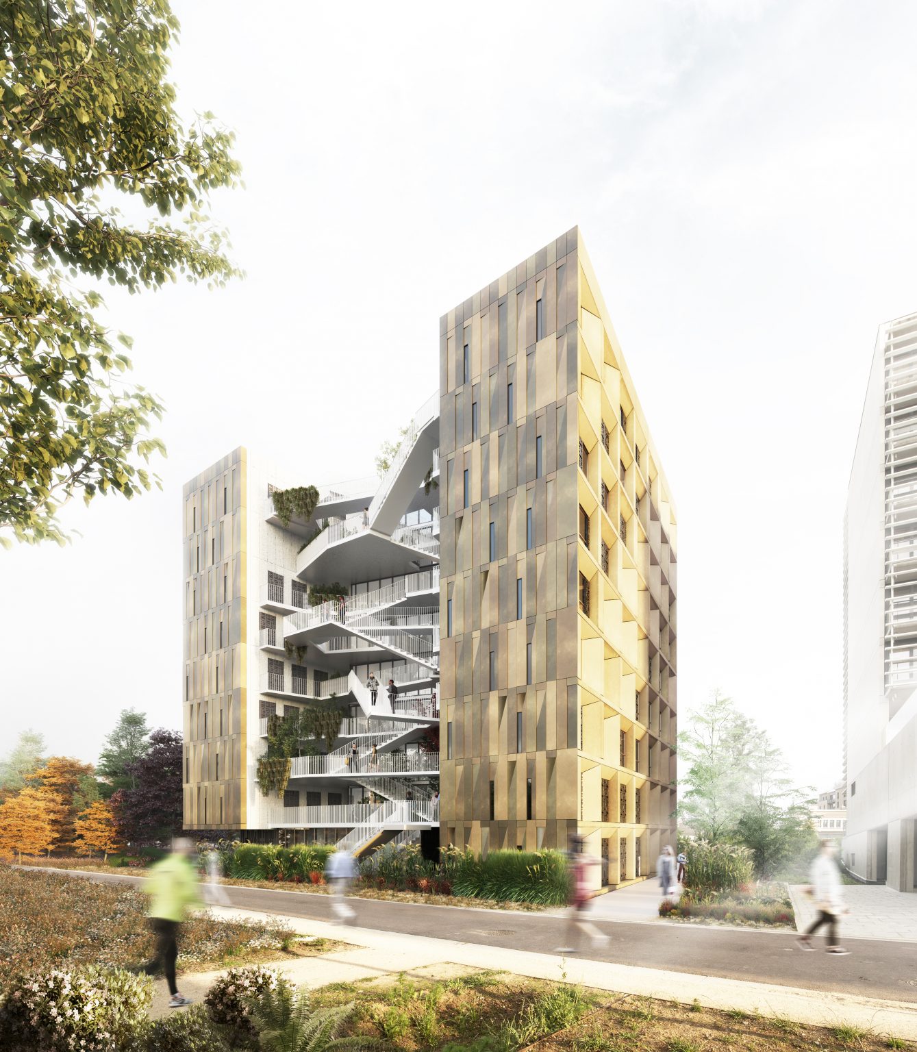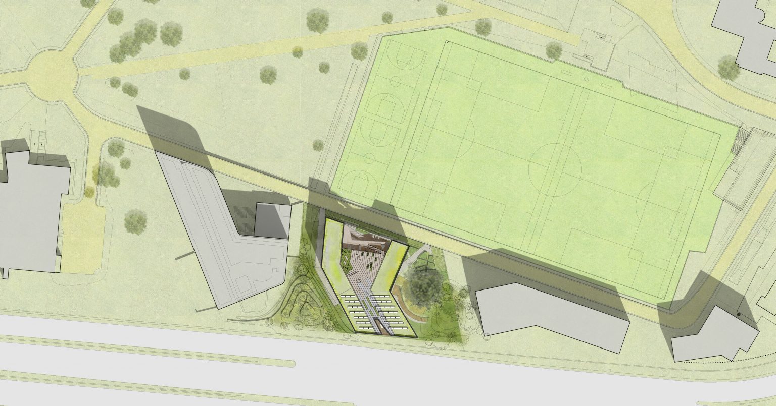 Le projet s’articule autour de deux ailes principales. À l’est, l’aile s’adosse au jardin du monde, tandis qu’à l’ouest, elle longe un parvis partagé avec la Maison de la Corée, lequel se prolonge en un talus végétalisé vers le périphérique. Ces deux volumes inclinés définissent des espaces résidentiels intimes, tandis qu’un espace central, pensé comme un noyau de liaison et d’échange, relie ces deux entités. Ce volume central s’épanouit en direction du nord, offrant des vues dégagées sur le parc et favorisant une relation fluide avec l’environnement extérieur.