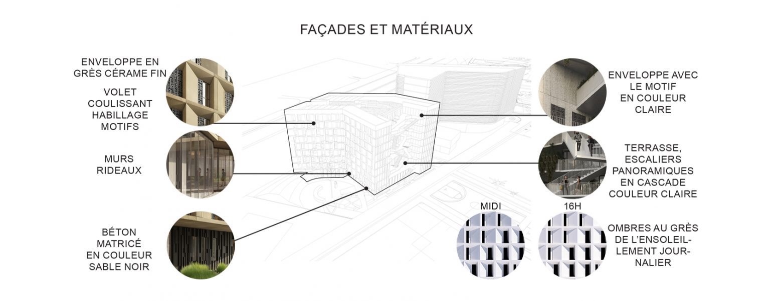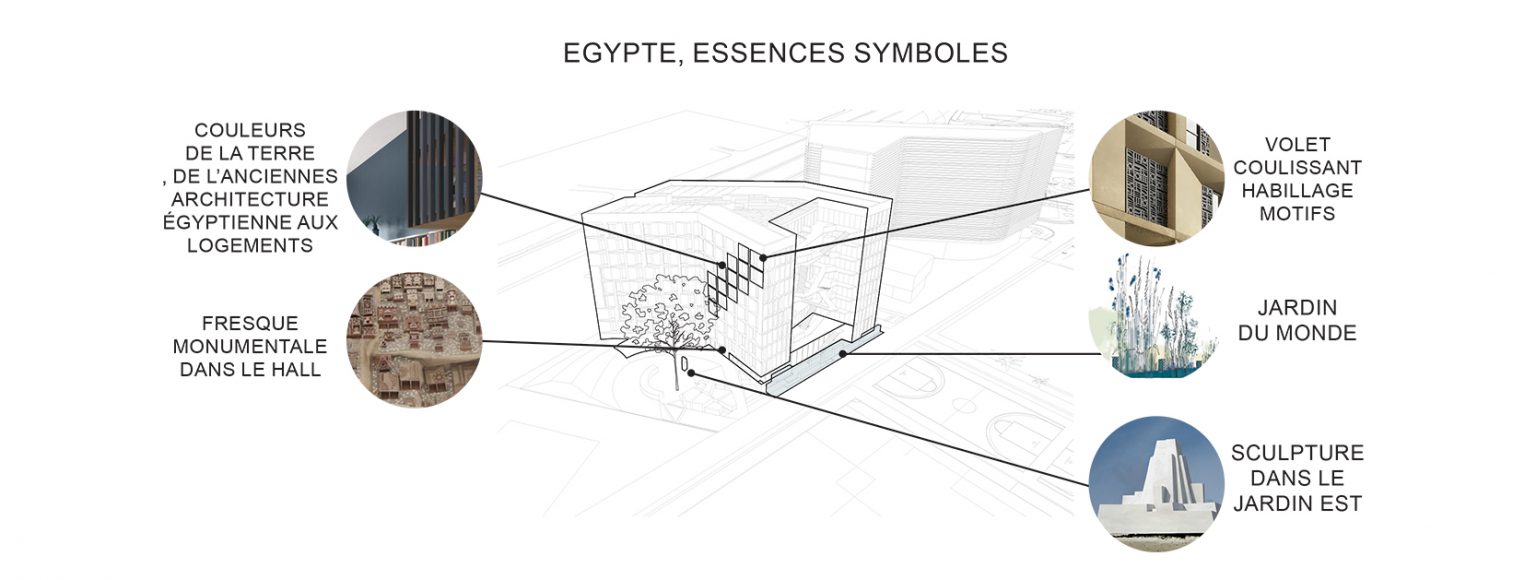 La Maison de l’Égypte fusionne identité nationale et environnement, explorant une démarche architecturale alliant observation, analyse et création. Le bâtiment, dual, protège du périphérique et s'ouvre sur le parc.