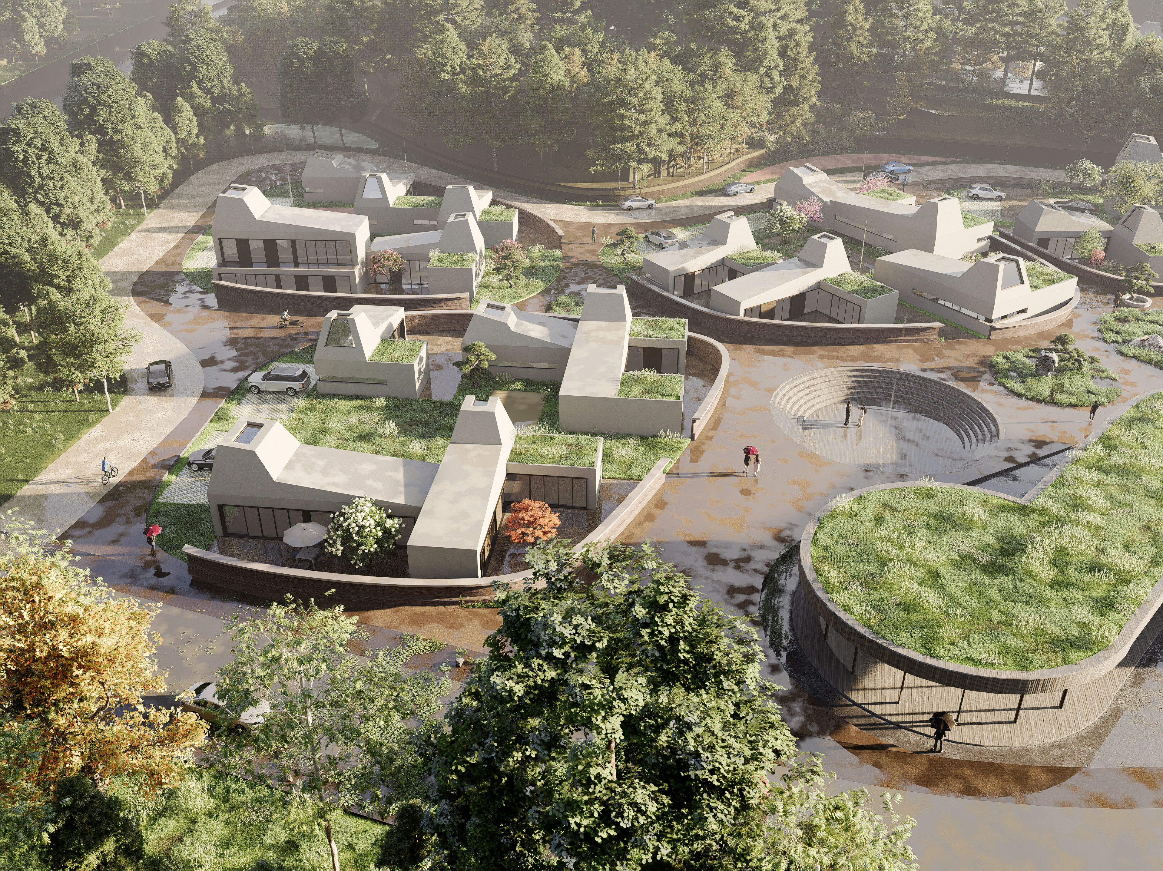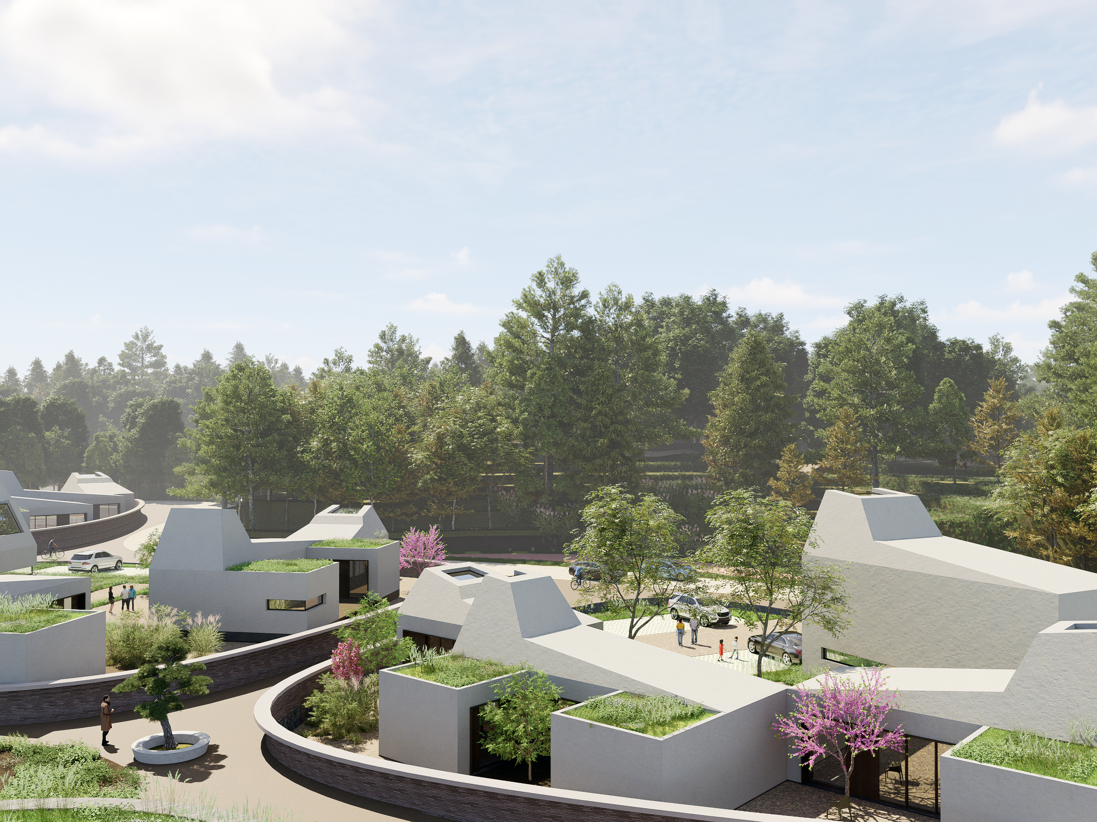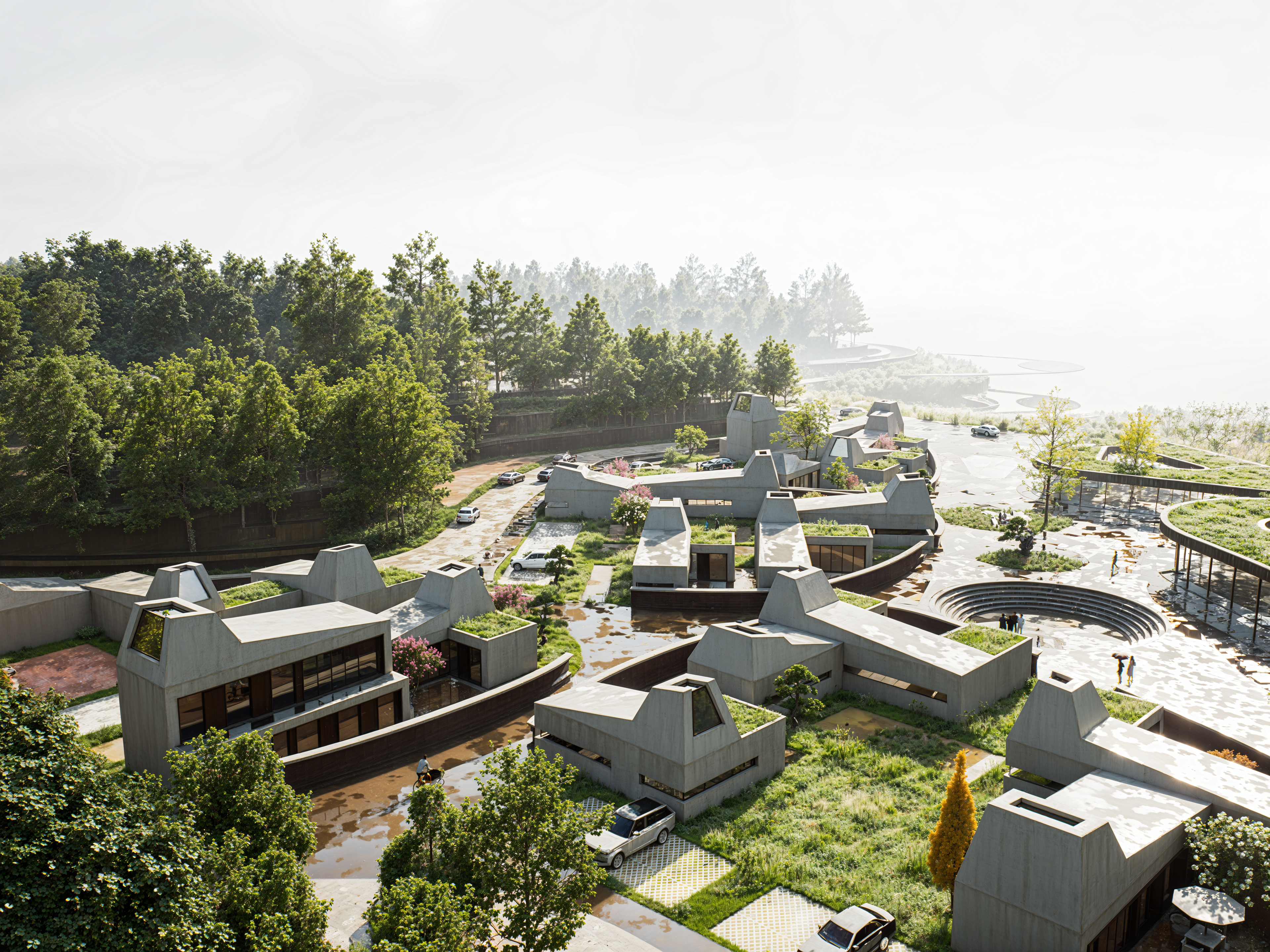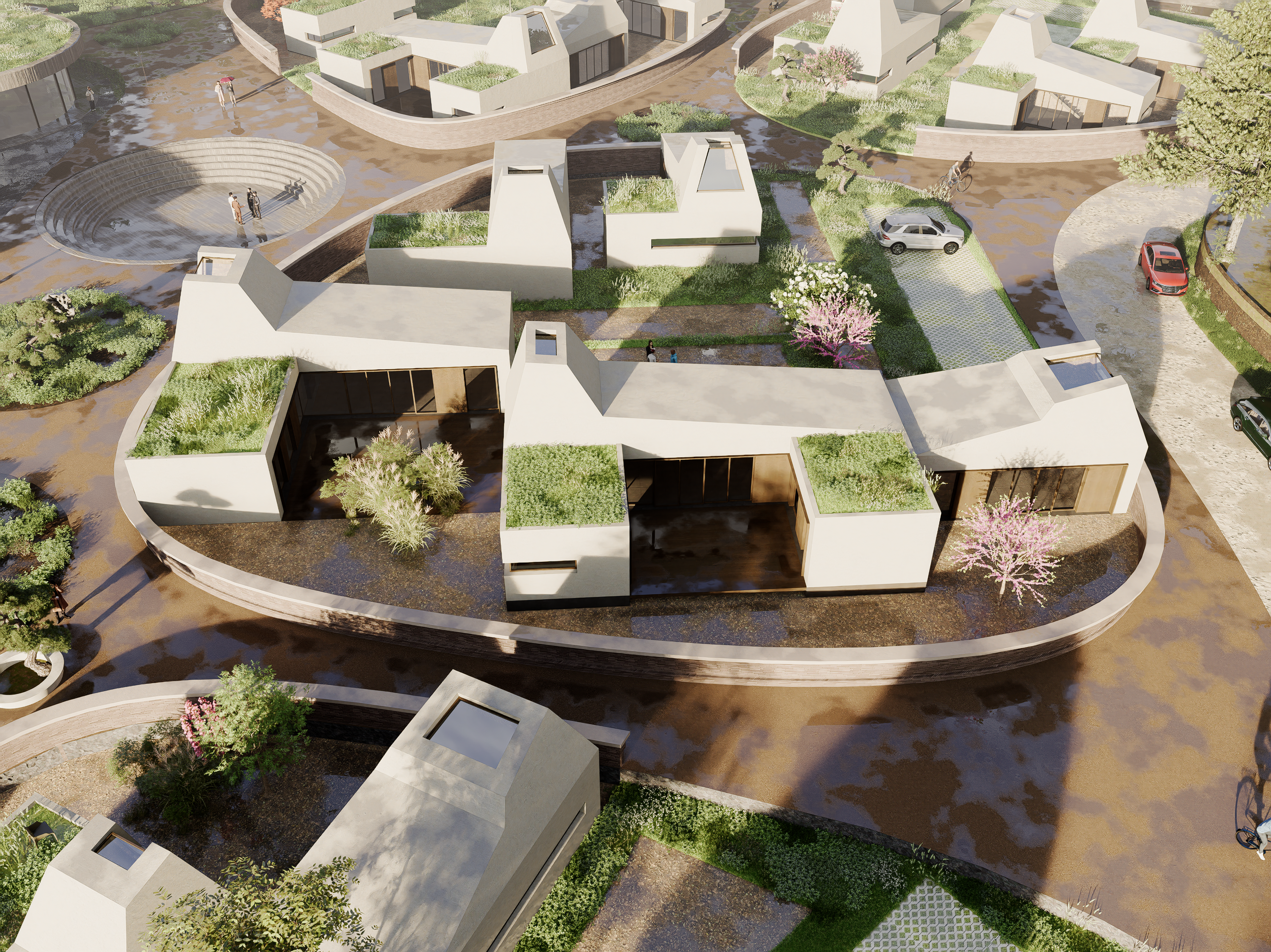 Les blocs résidentiels sont orientés pour éviter les expositions au nord et sont conçus de manière à ce que chaque unité soit isolée des autres. Composés de 9 blocs au total, ils sont directement connectés à une route réservée aux résidents. Les divers espaces extérieurs sont thématisés en fonction des caractéristiques de chaque communauté, incluant des potagers communautaires et des espaces d'échanges pour les résidents. Les clôtures des blocs résidentiels, réalisées en pierre, terre et mortier, sont conçues avec des courbes, mettant en valeur les façades angulaires des bâtiments. Ces clôtures, formant une limite horizontale naturelle, s'intègrent harmonieusement avec les jardins intérieurs de la collectivité, contribuant à l'esthétique générale du village.
