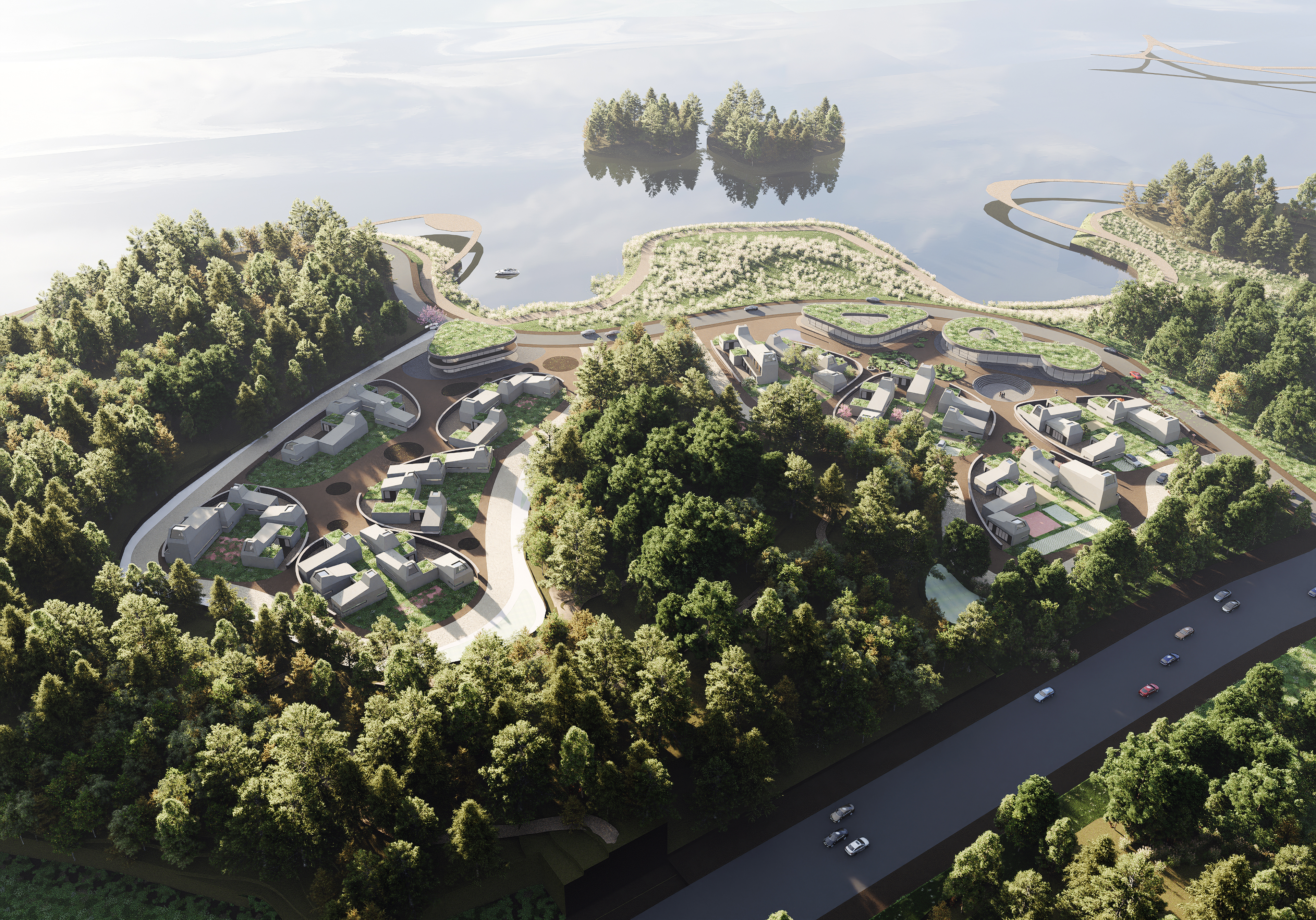 L'aménagement du site tire parti des pentes naturelles douces, permettant un agencement organique et naturel qui favorise la circulation piétonne tout en offrant des vues sur le Ho-min-ji. La fusion des blocs résidentiels, des ruelles et de l'environnement naturel contribuera à créer l'image d'un village communautaire vivant.