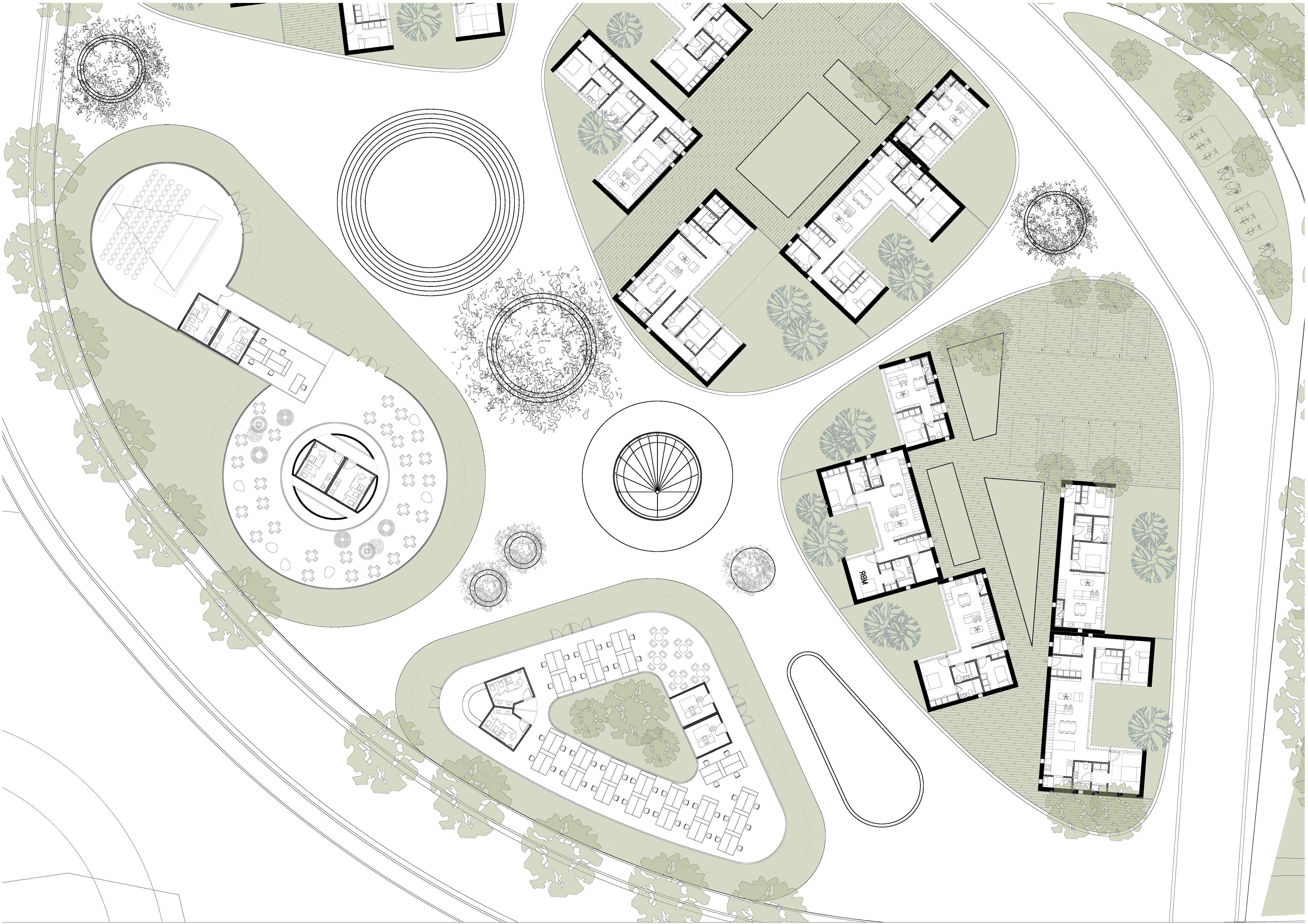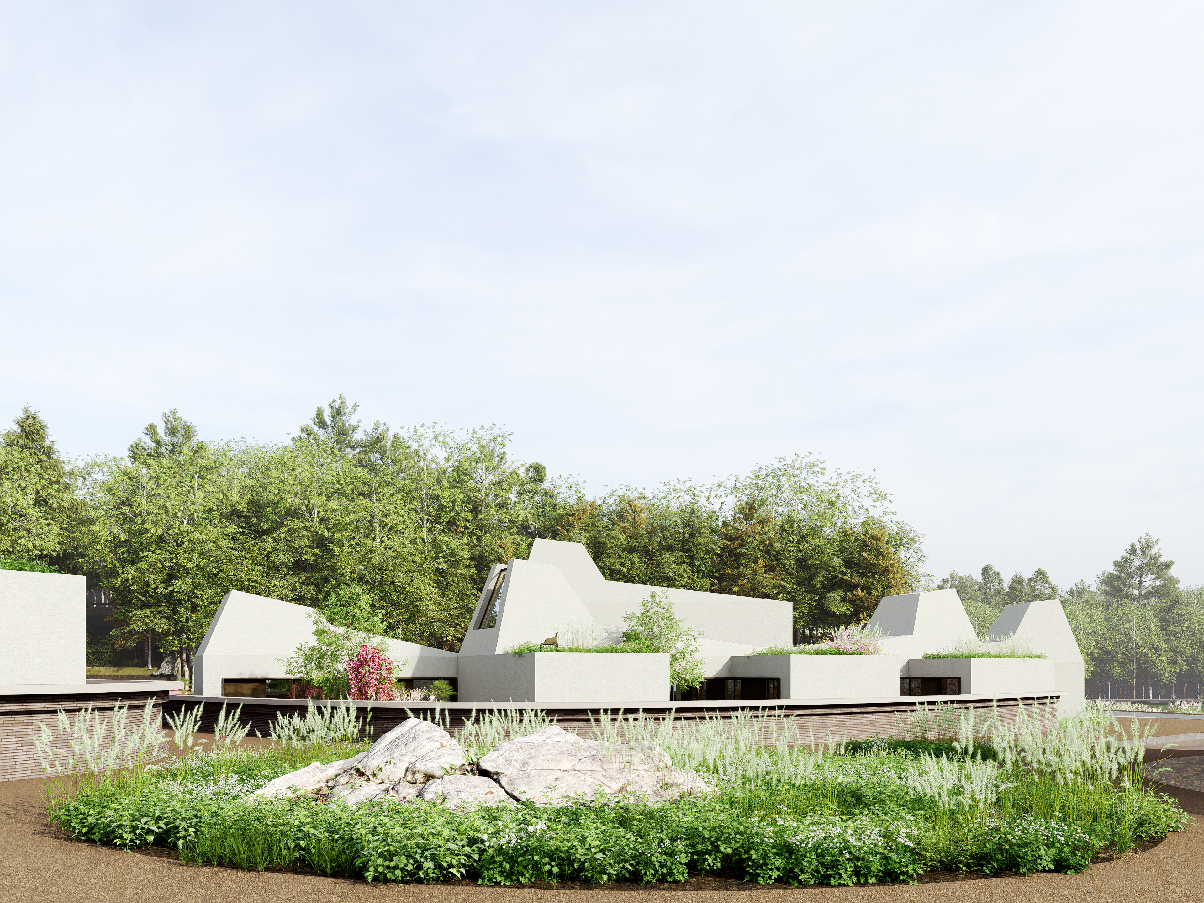 Entre les espaces communautaires et la collectivité résidentielle, un espace paysager aux courbes naturelles est prévu, intégrant des thèmes tels que la science, le débat, le partage et la nature. Ces espaces extérieurs se caractérisent par des formes horizontales et décontractées, valorisant le vide et les marges. Les zones communautaires sont organisées sous forme de bâtiments individuels en fonction de la nature de chaque programme, avec une connexion fluide entre la zone de gestion, la salle de conférence et le salon, facilitant ainsi les échanges entre résidents et visiteurs. Des forums de discussion en plein air et des places solaires sont également intégrés pour un accès direct à l'extérieur.