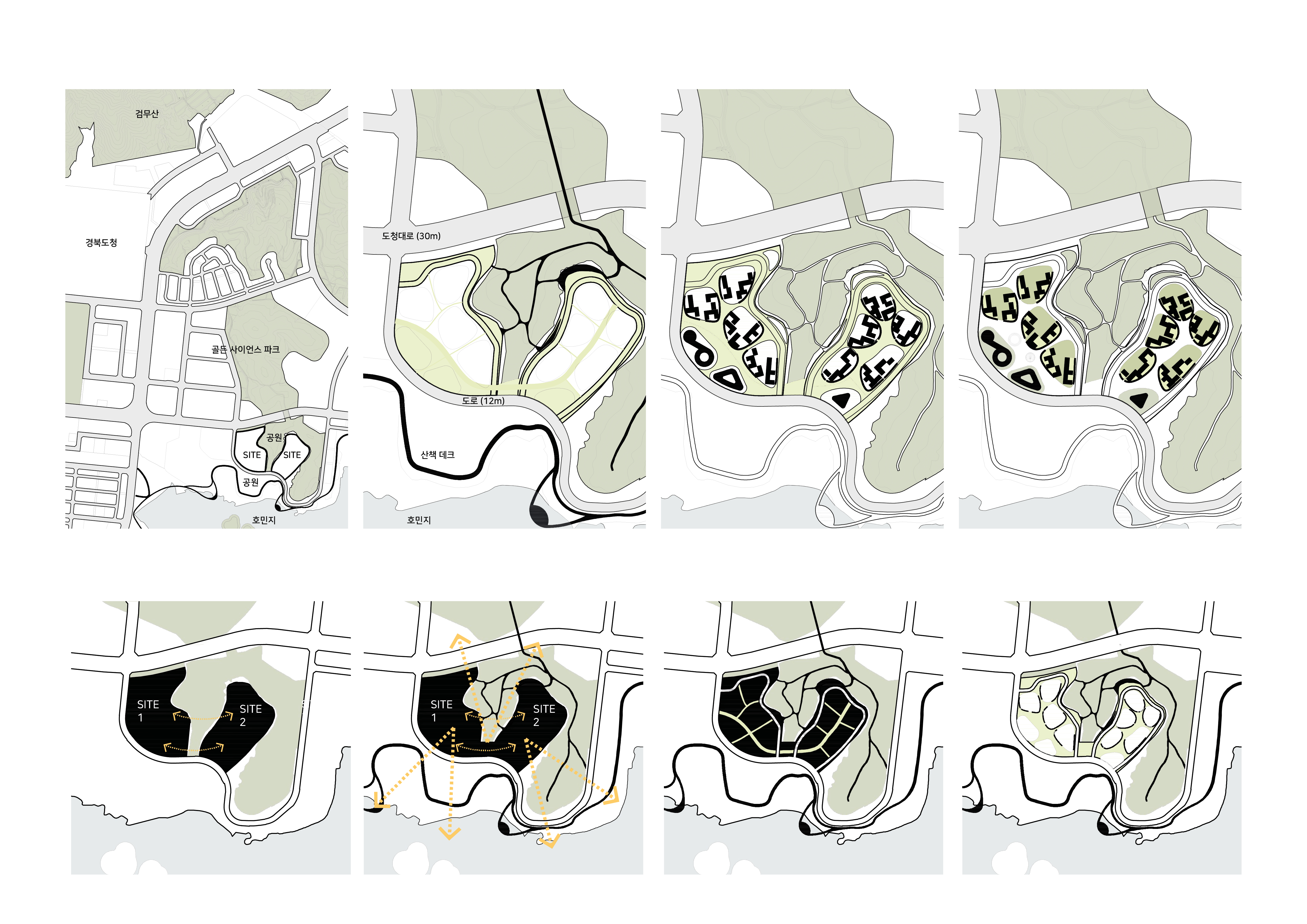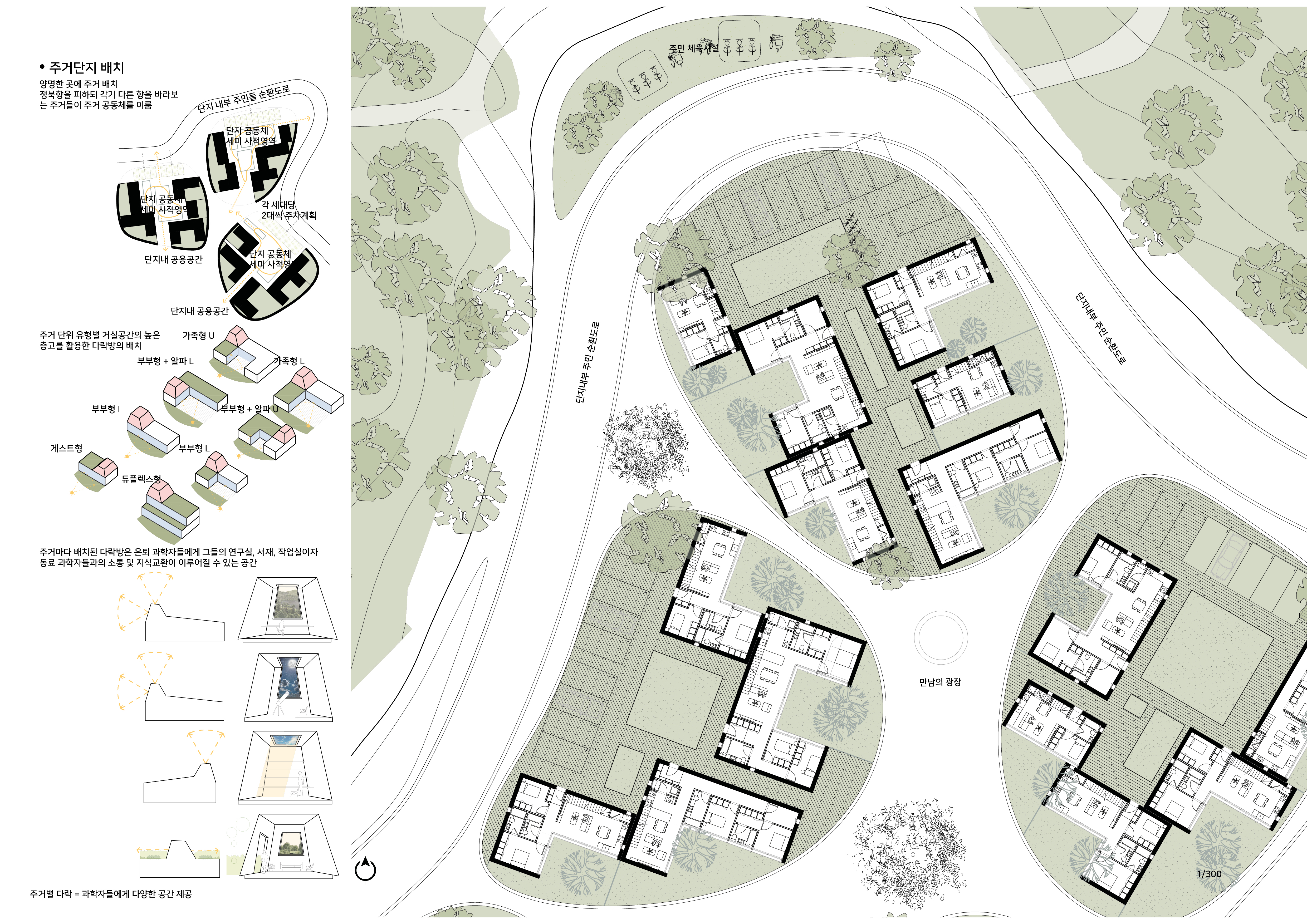 Cette proposition s'inspire de la topographie naturelle du site, favorisant un aménagement organique qui facilite la circulation piétonne et encourage les interactions entre résidents et visiteurs. Les blocs résidentiels sont agencés autour de ruelles, permettant une transition fluide entre les espaces extérieurs et le paysage environnant. Chaque élément de conception est intégré de manière cohérente, respectant les caractéristiques culturelles et environnementales de Hahoe. L'accent est mis sur la création d'un village qui favorise les échanges entre habitants et visiteurs, rompant ainsi avec l'image uniforme d'un complexe et privilégiant une communauté vivante à échelle humaine. De plus, les voies de circulation des résidents sont séparées pour garantir leur indépendance et leur intimité. Le village se compose de blocs résidentiels, d'équipements communautaires et de ruelles. Les chemins reliant les routes intérieures au village sont conçus comme des espaces ouverts, permettant aux visiteurs et aux scientifiques retraités d'interagir librement et de partager leurs connaissances. Les programmes communautaires sont organisés le long de la route extérieure de 12 mètres, facilitant l'accès et créant un espace de proximité au village.