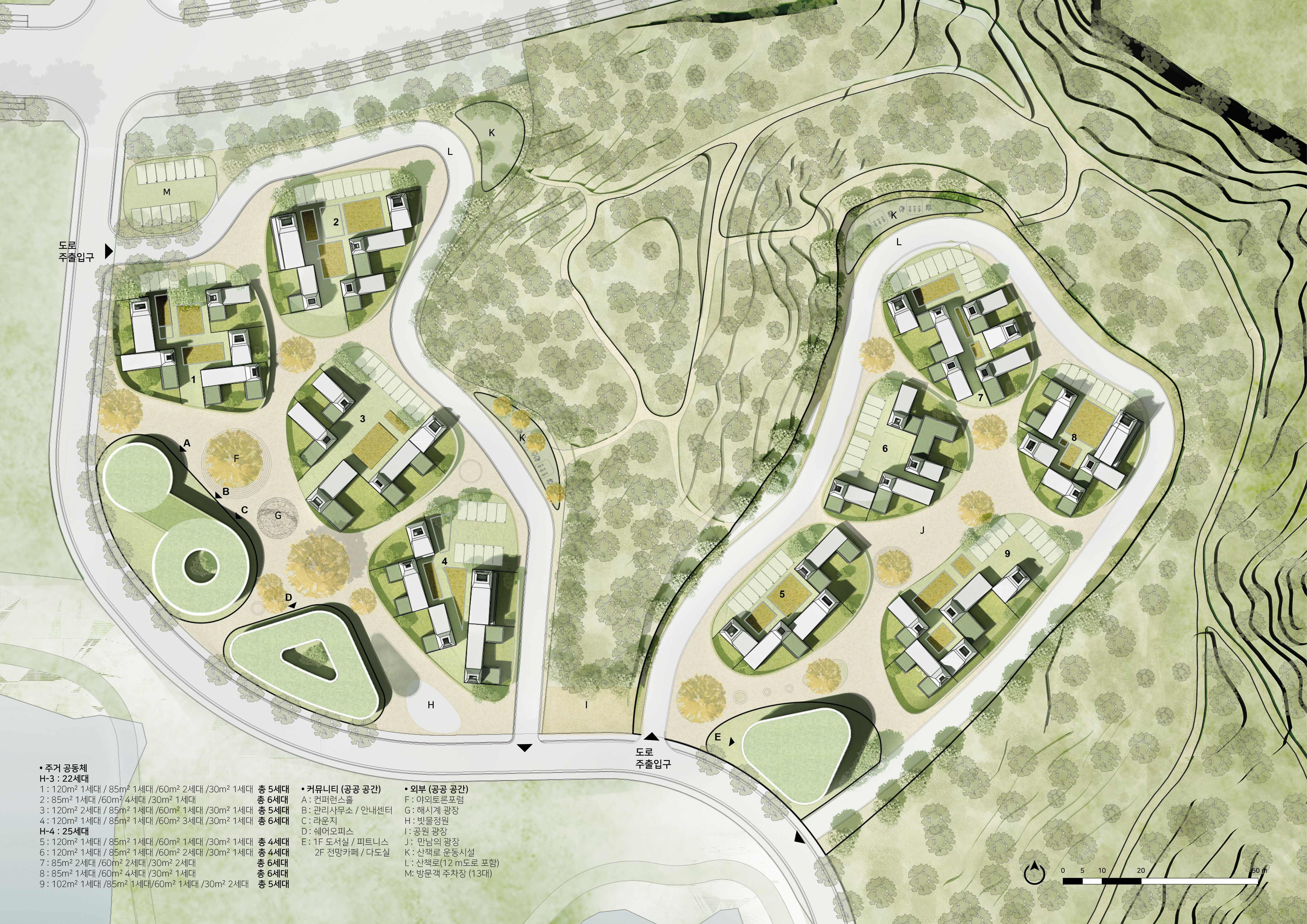 Le village de Hahoe, situé à proximité du site, constitue une collectivité où des familles portant le même nom se rassemblent pour apprendre l'agriculture et la science, au sein d'une communauté riche de 700 ans d'histoire. Cette belle région du Gyeongsangbuk-do, traversée par la rivière Nakdong et entourée de collines douces, présente un environnement naturel abondant, semblable à celui du site projeté. Ce contexte inspire la composition communautaire de notre projet.