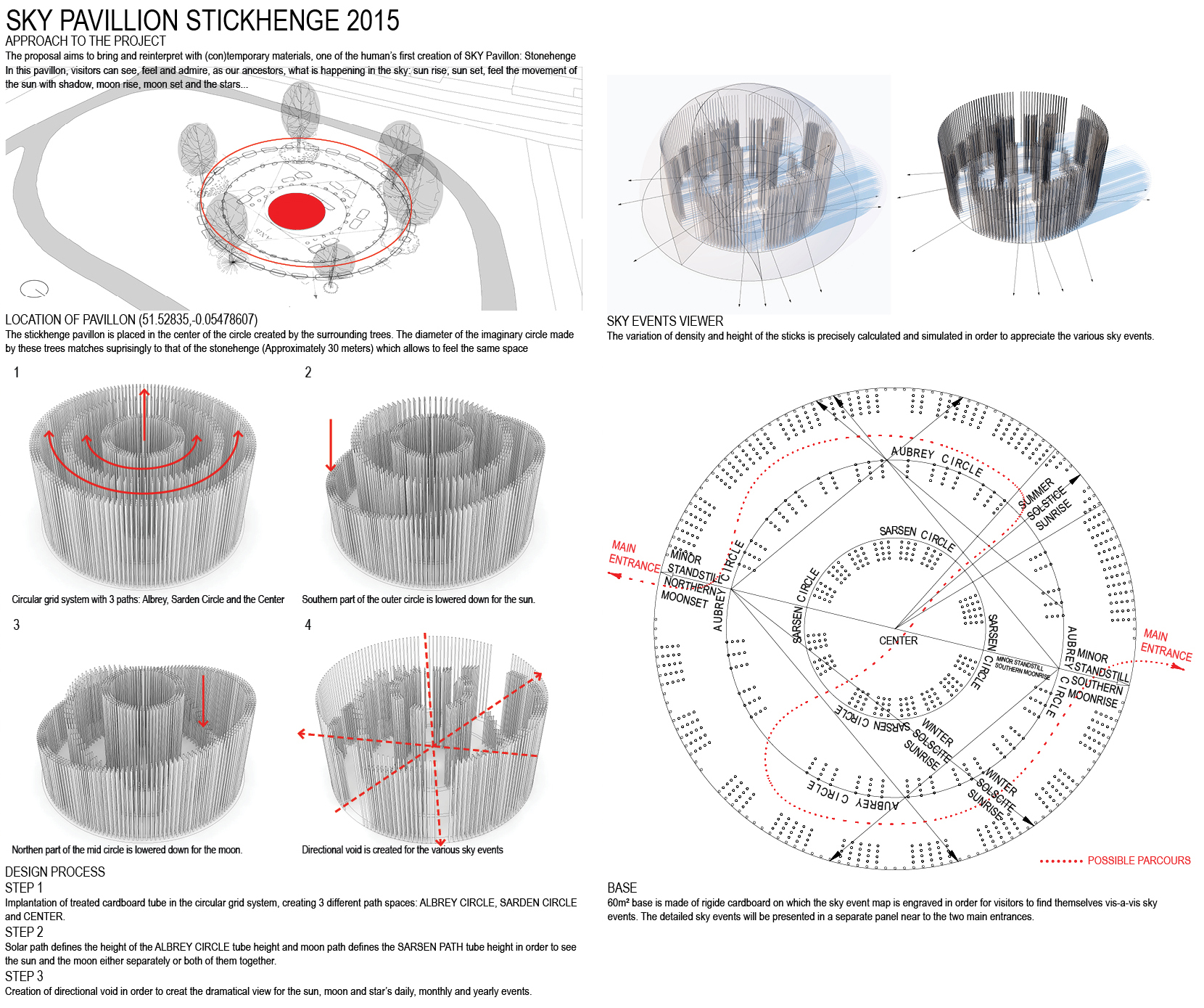 Le Museum Gardens est principalement utilisé comme espace de détente pour les habitants, les travailleurs et les visiteurs des environs. Il est essentiel que le pavillon exploite pleinement ce lieu important. La proposition de Reset Studio vise à réinterpréter de manière contemporaine Stonehenge, l’un des premiers monuments construits pour observer et apprécier les mouvements du ciel. Dans notre vie quotidienne, nous avons souvent tendance à négliger la complexité et la beauté des mouvements naturels qui nous entourent. Ce pavillon offrira aux visiteurs l’opportunité de marcher lentement et de suivre les parcours physiques et mentaux tracés par nos ancêtres. À l'instar de Stonehenge, les ouvertures du pavillon sont alignées sur des cycles solaires et lunaires importants, permettant aux visiteurs de vivre les phénomènes naturels périodiques. À l’intérieur du pavillon, des structures verticales orientent le regard des visiteurs vers le ciel, tandis que les espaces ouverts des sentiers permettent d’observer l’horizon, élargissant ainsi la perception des cycles de la Terre. Ce pavillon, bien que d’inspiration préhistorique, se distingue par des matériaux et un contexte résolument moderne. Étant une structure temporaire, ses éléments verticaux sont fabriqués en tubes de papier. Cela reflète l'idée de transformer des matériaux naturels en éléments de construction, rappelant en ce sens le processus de construction de Stonehenge. Dans ce pavillon, nous pouvons, comme nos ancêtres, voir, ressentir et admirer les phénomènes du ciel : le lever du soleil, le coucher du soleil, le mouvement du soleil à travers les ombres, le lever et le coucher de la lune, ainsi que les étoiles...